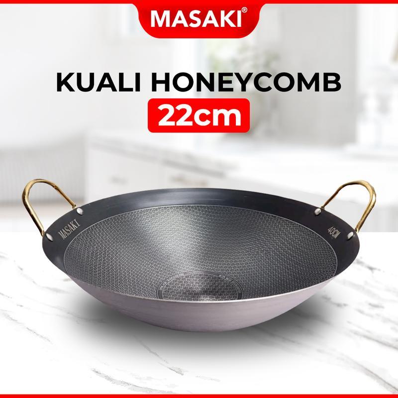 MASAKI 40cm Kuali Honeycomb with Golden Handle Stainless Steel Korean Honeycomb Etching Coating Black Wok Honey Comb Wok Sudip Besi Pan Wok Kitchenware