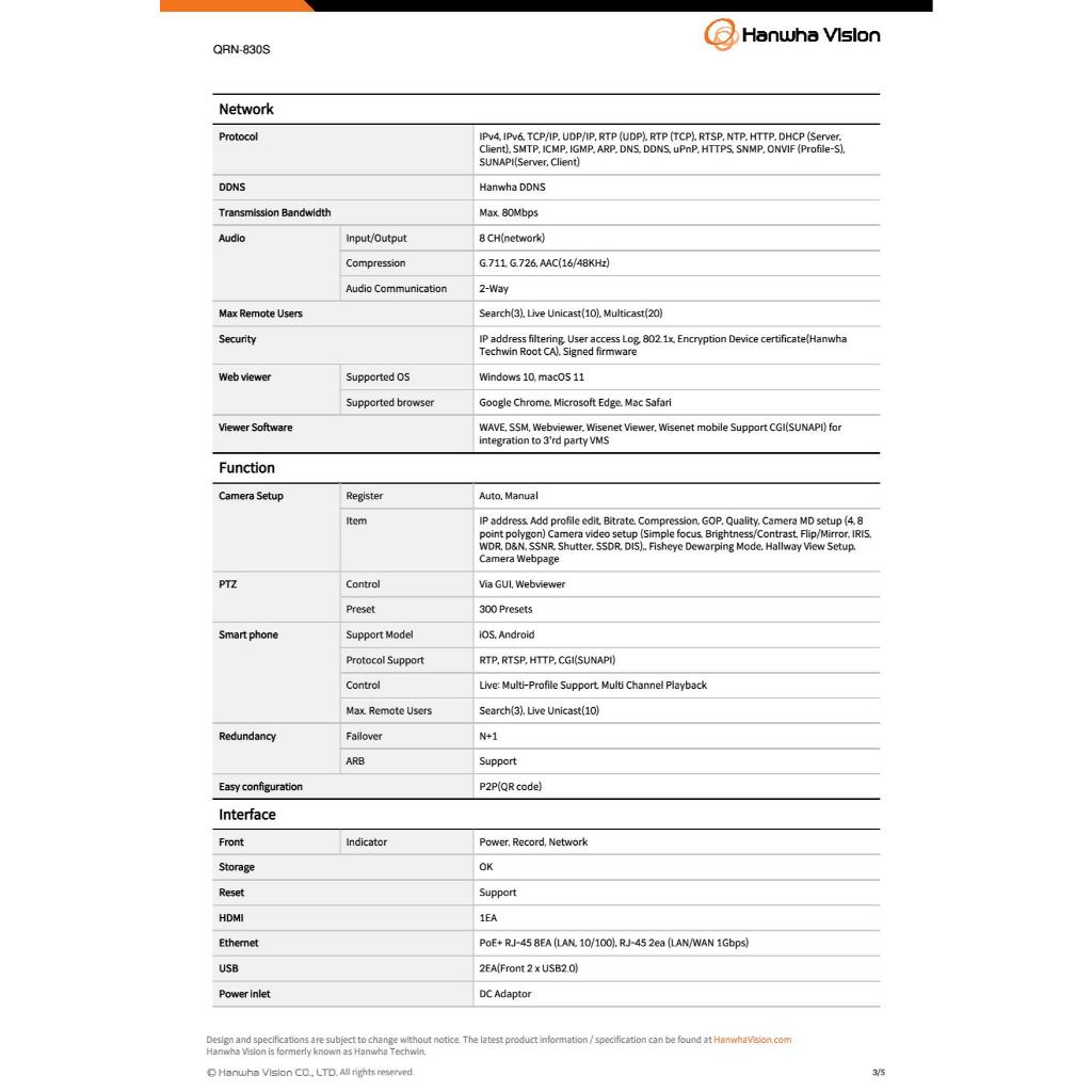HANWHA VISION QRN-830S Network QRN-830S Network 8CH 4K H.265 c/w Build in PoE Ports Build in 1 HDD Slot NVR
