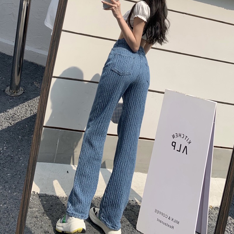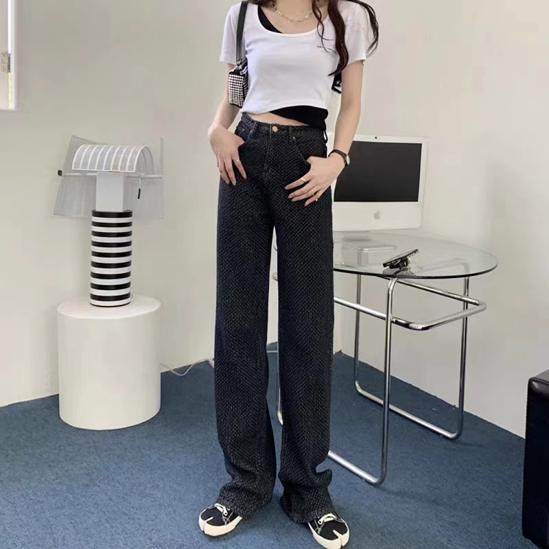 Waffle weave denim long pants high waist wide leg straight full retro vintage knit plus size large size jeans trousers