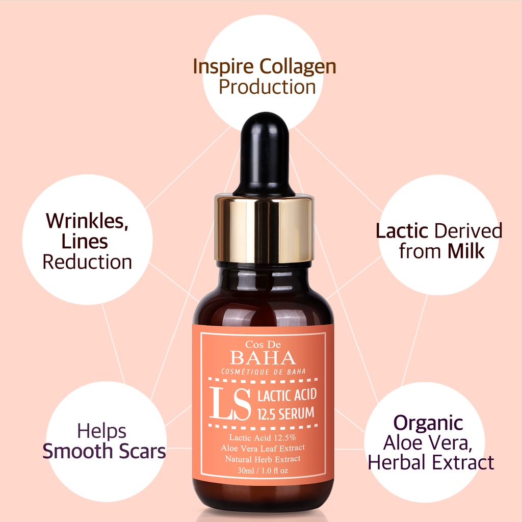 [Cos De BAHA]Lactic Acid 12.5% AHA Facial Serum 30ml - Face Acne Treatment Dark Spots Blackhead Remover Reduce Wrinkles Anti Aging Scars Pores Pimples Exfoliates Dead SkinGlow Care