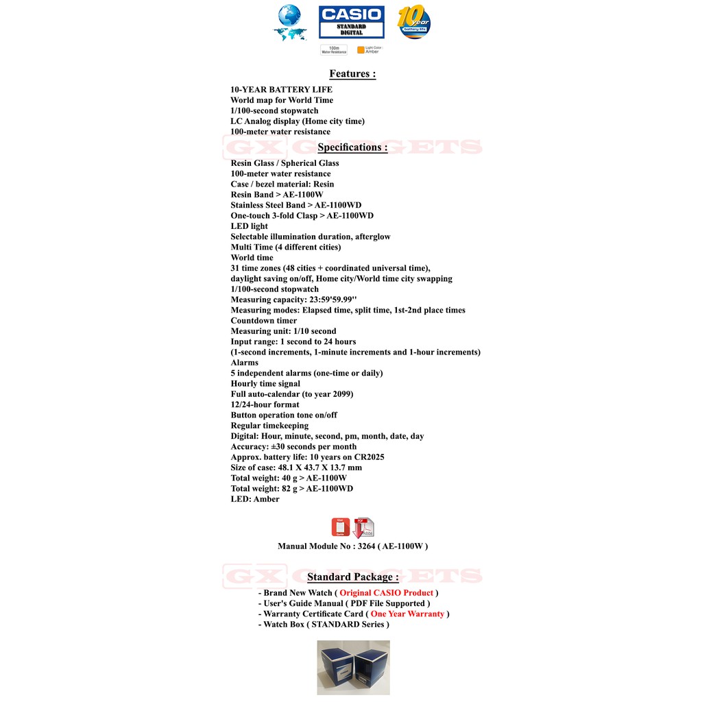 CASIO AE-1100W-1BV STANDARD DIGITAL WATCH WORLD MAP TIME 10YEAR BATTERY ALARM TIMER STOPWATCH LED LIGHT WR100M AE-1100W