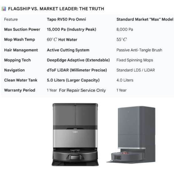TP-Link Tapo RV50 Pro Omni Flagship Robot Vacuum 15000Pa Suction 60°C Hot Water Mop Wash Dual-Laser AI Avoidance