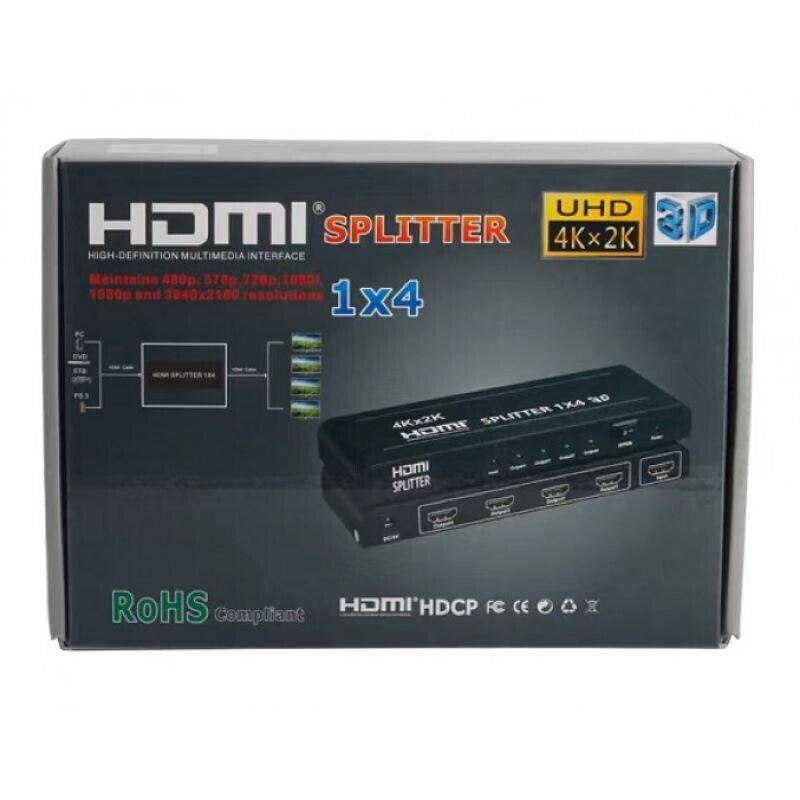 1X4 HDMI Splitter 4Kx2K Powered Kit - 4 Port Hub 1 in 4 Out Display Repeater 1080P Duplicator - 4 HDMI Powered Splitter