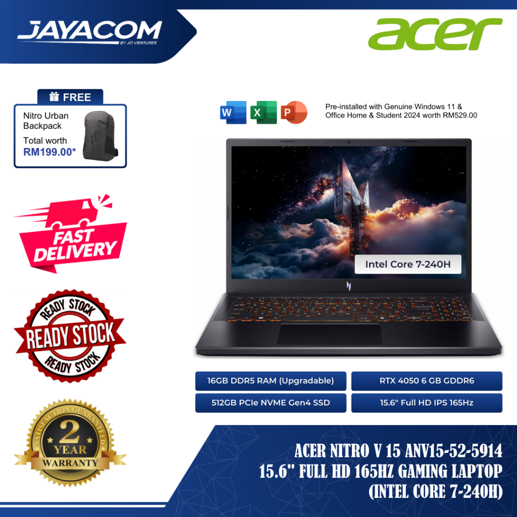 Acer Nitro V 15 ANV15-52-5914/7287 15.6" FHD 165Hz Gaming Laptop (Intel C5, C7 / 16GB DDR5 / 512GB SSD / RTX4050 / W11)