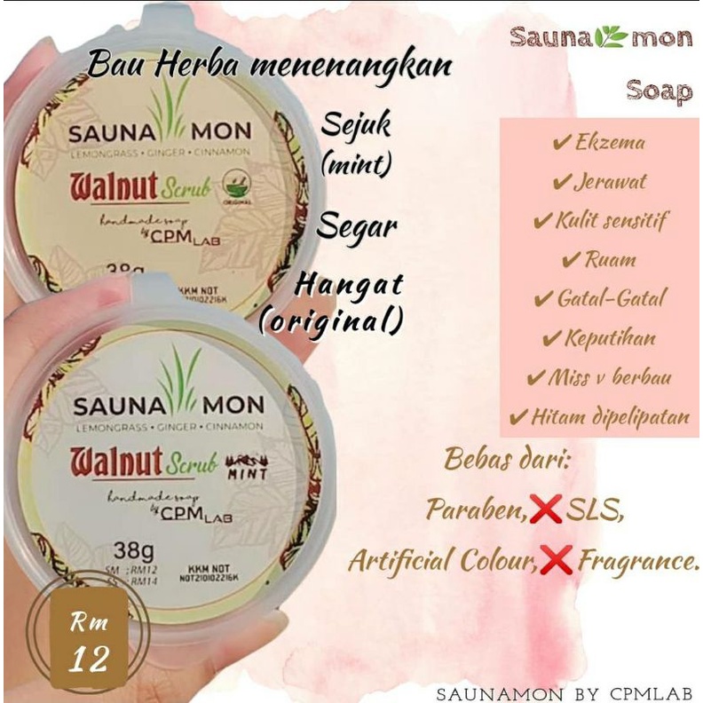 SABUN SAUNAMON WALNUT SCRUB 100% HERBA UNTUK DAKI/KULIT MATI/CERAHKAN CELAH PELIPAT KETIAK/SELULIT/ TERAPI MINDA 38GRAM