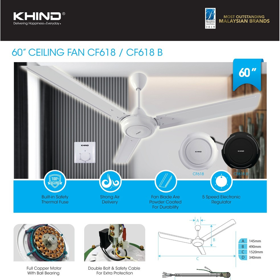 Khind CF618 CF625 Black/White/Brown Colour Ceiling Fan 3 Metal Blade 60" Inches Kipas Siling Rumah