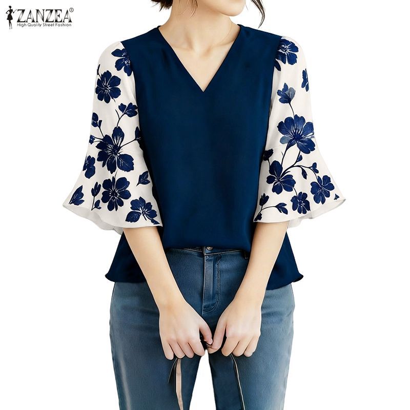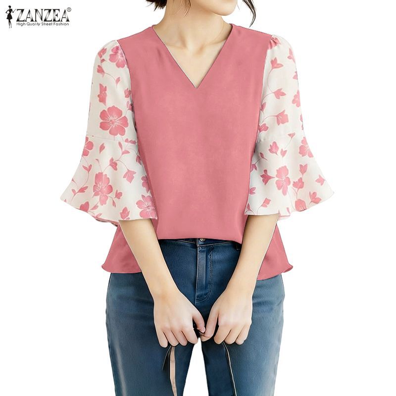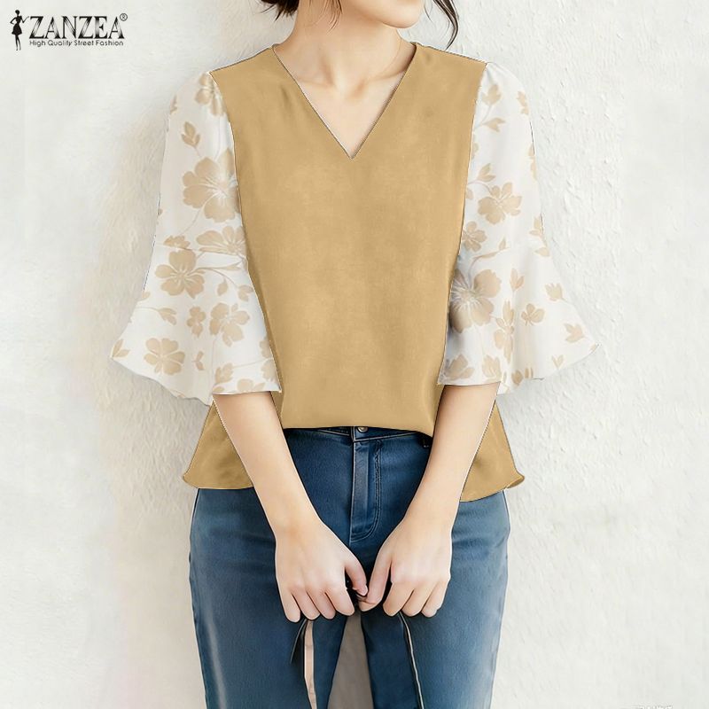 ZANZEA Women's Elegant Vintage Floral Print V-neck Blouse with 3/4 Flare Sleeves