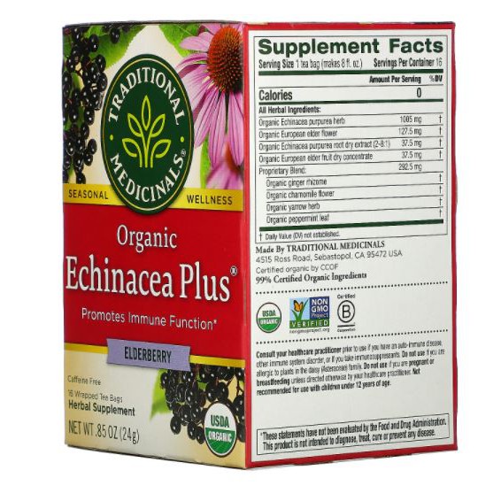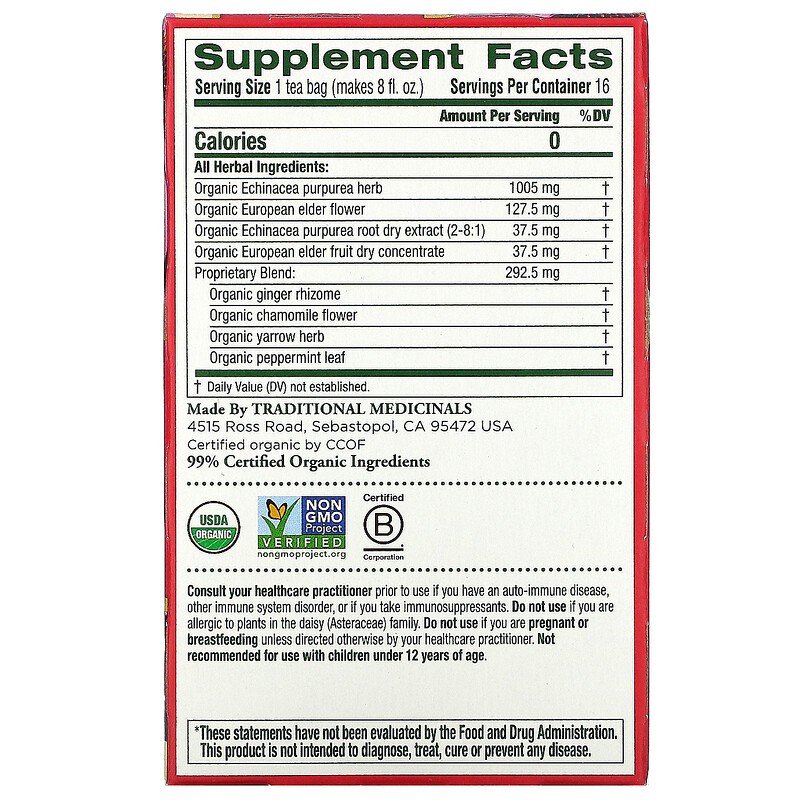 Traditional Medicinals Organic Echinacea Plus Elderberry / Spearmint Caffeine Free 16 Wrapped Tea Bags
