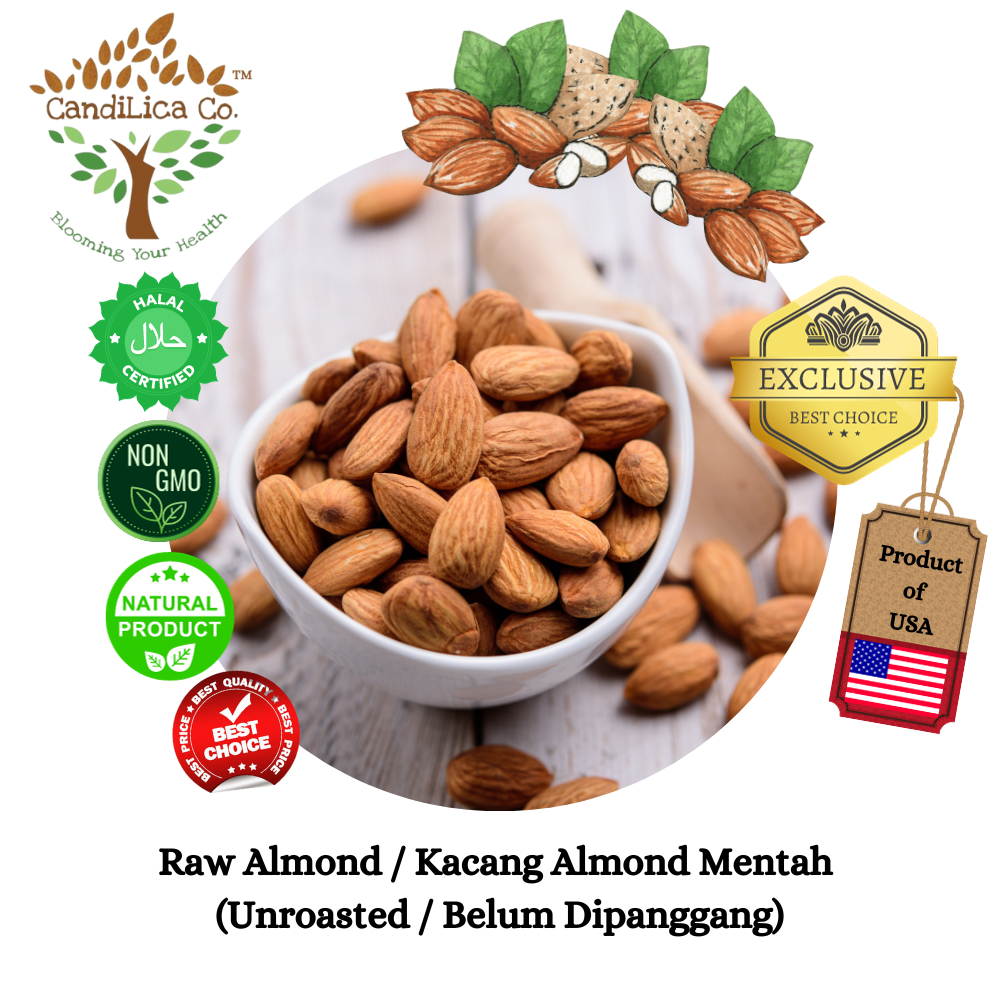 Raw Almond (25/27) Unroasted | Kacang Almond Mentah (Belum Dipanggang) | 生杏仁– CandiLica Co. –USA Imported– 250g/500g/1Kg