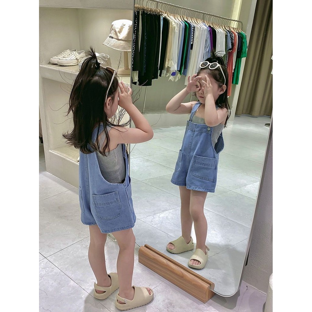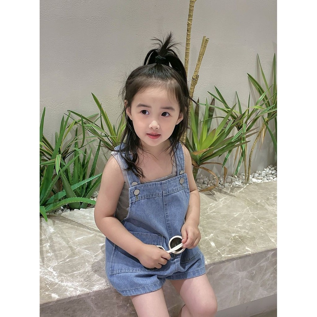 Seluar Jeans Budak Perempuan Denim Pants 2pcs Baby Kids Suit Overall Jeans+grey West Denim Shorts Off Shoulder Top Girl s Clothing Kanak Kanak Perempuan 12 Tahun Baju Raya Gift