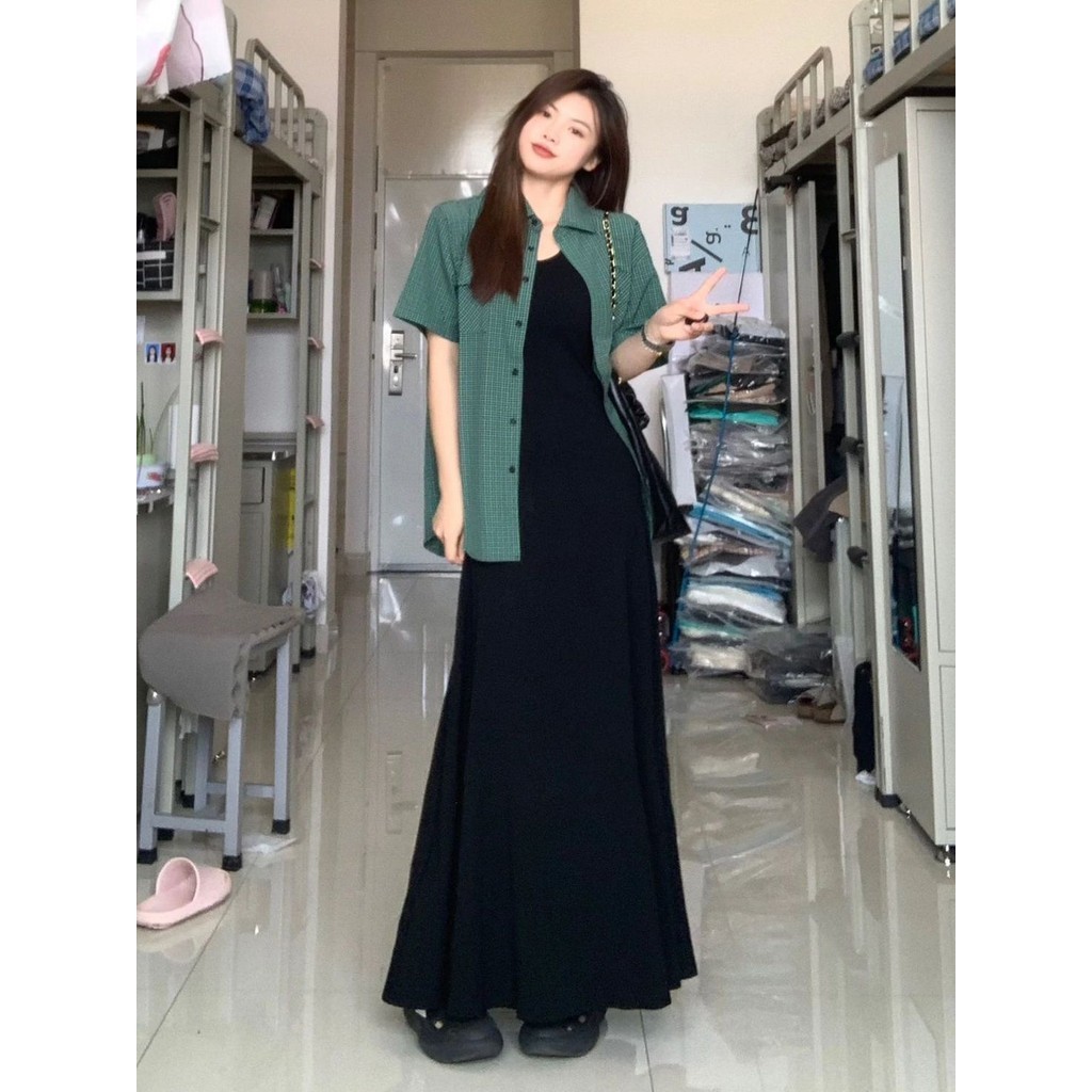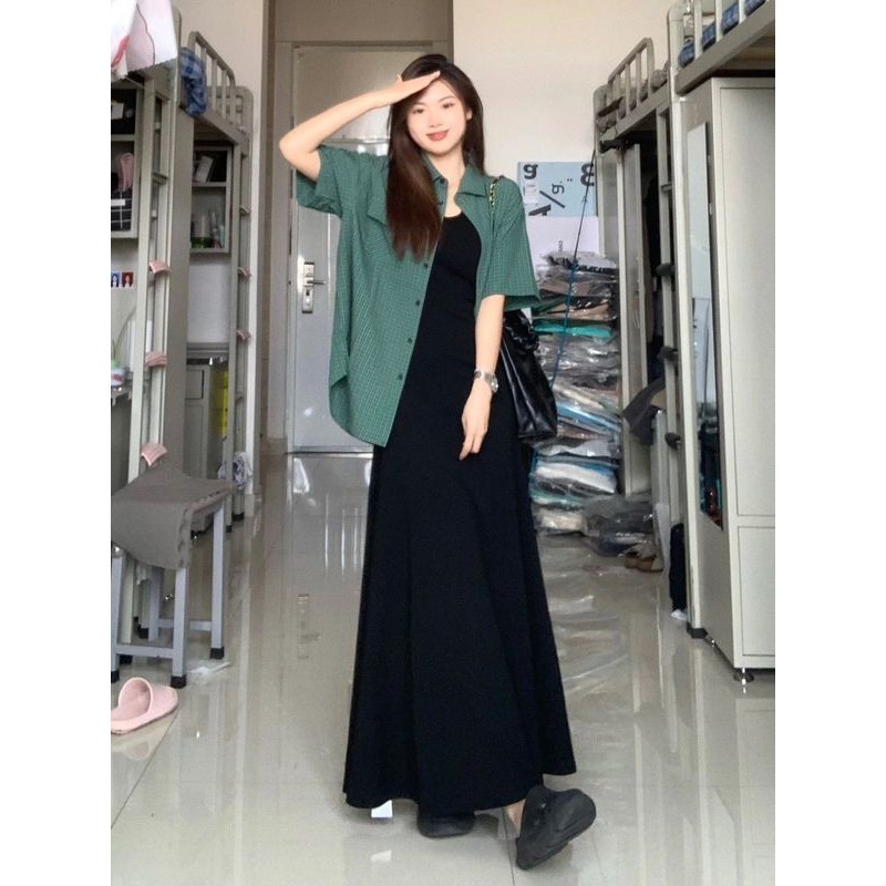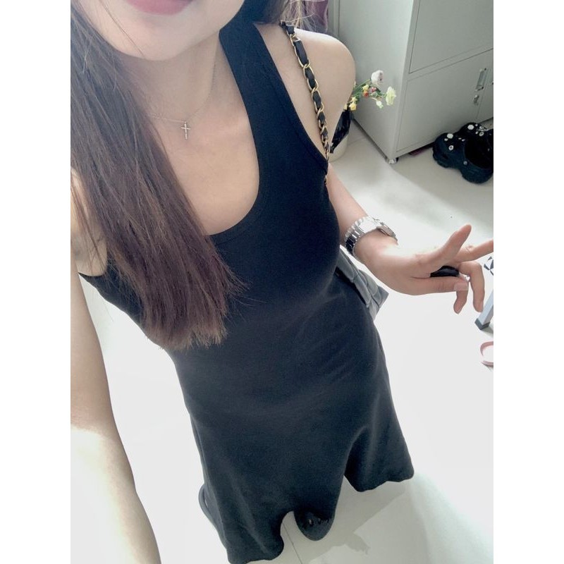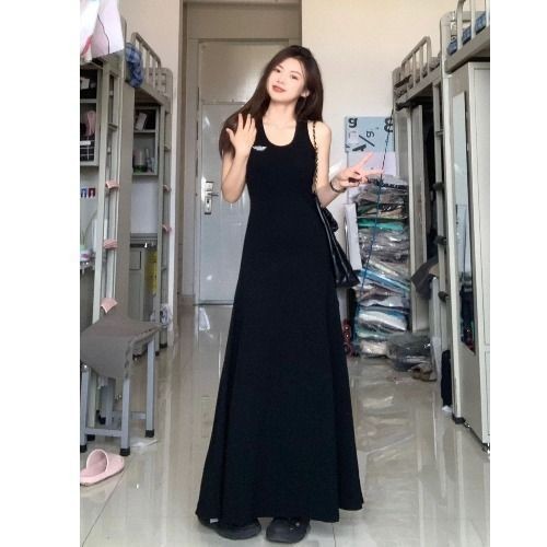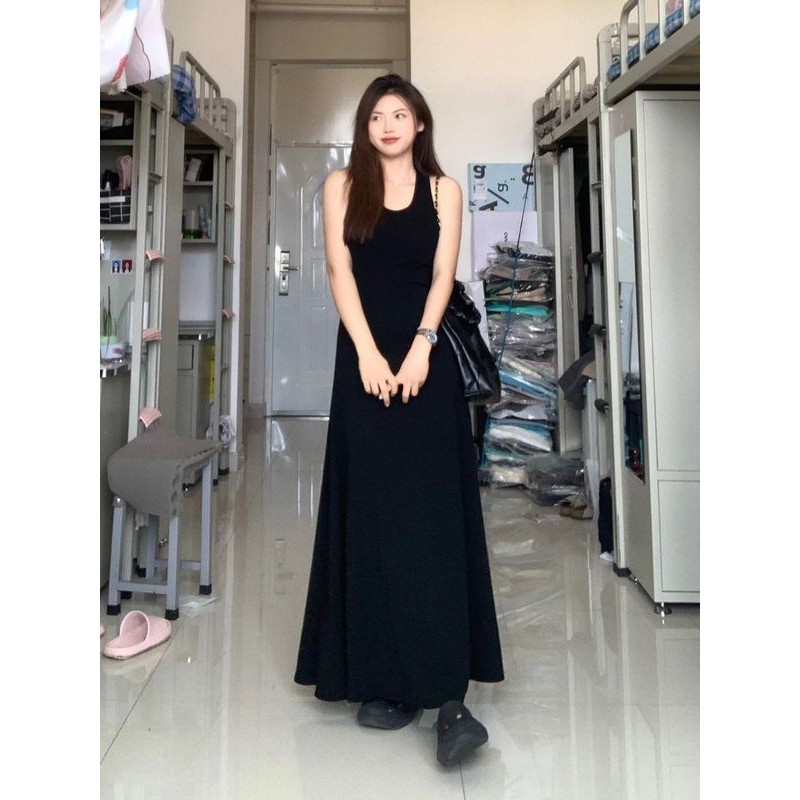 黑色 高级感 工字 背心 连衣裙 女 夏季 u领 吊带裙 收腰 显瘦 内搭 a字 长裙