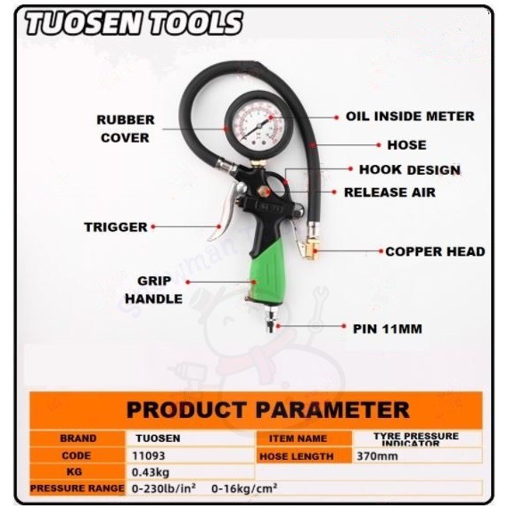 TUOSEN TYRE TIRE GAUGE PRESSURE AIR INDICATOR 11093 MEASURE CAR PSI METER KG M SQUARE UKUR TAYAR ANGIN PUMP PAM KERETA