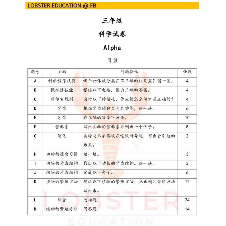 三年级 华文 马来文 英文 数学 科学 试卷 上半年Alpha版 Year 3 Chinese Alpha Edition
