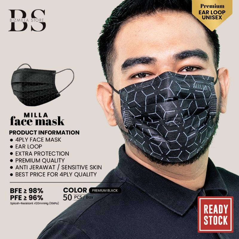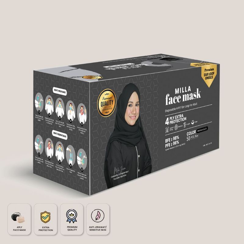 {4 Ply 50pcs} Black FaceMask EarLoop. Custom for sensitive skin. Bizmilla by Mila Jirin