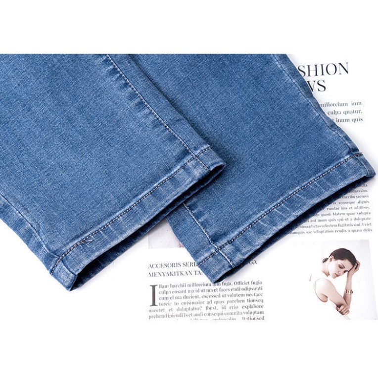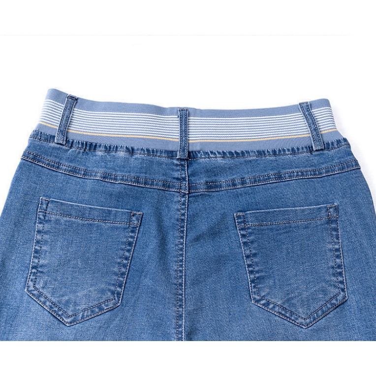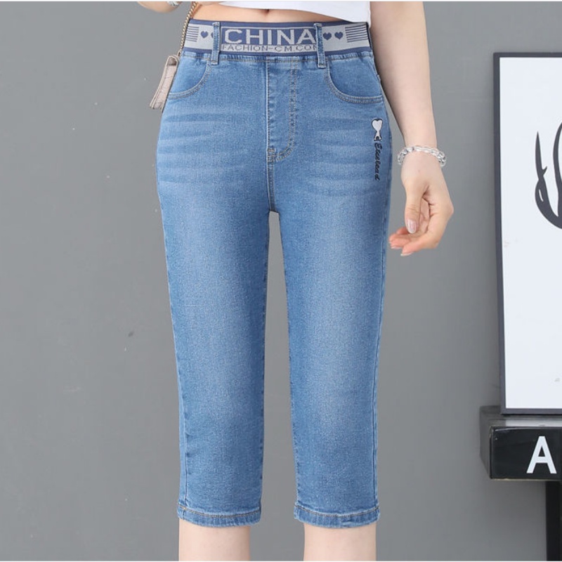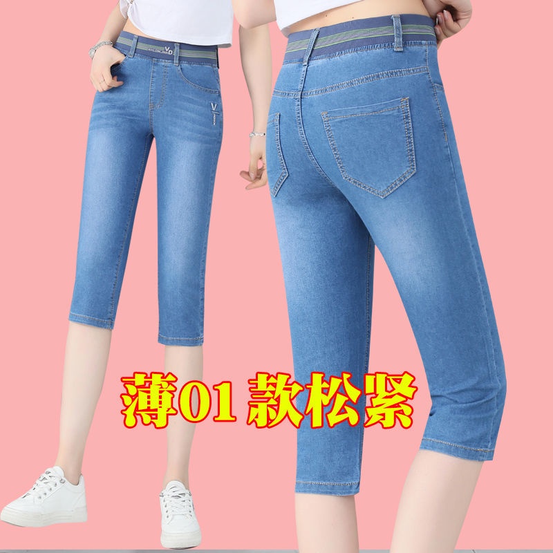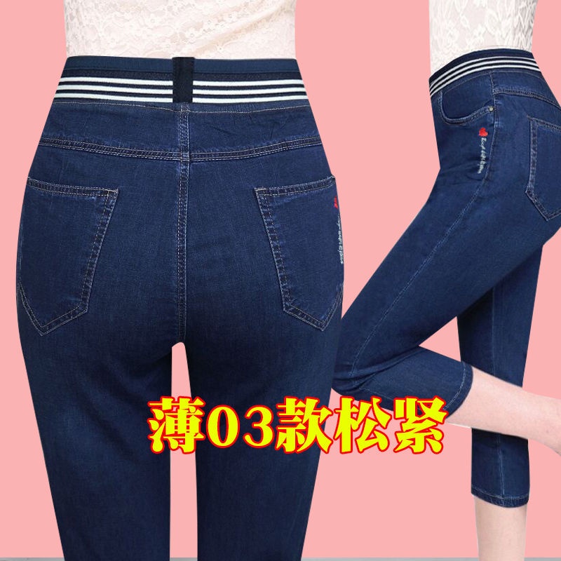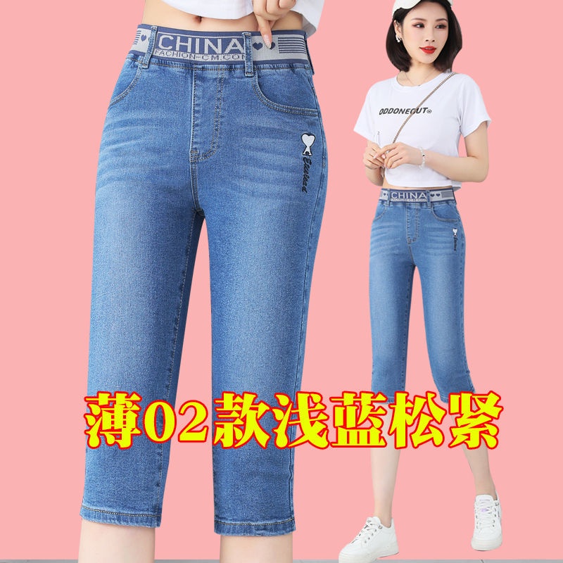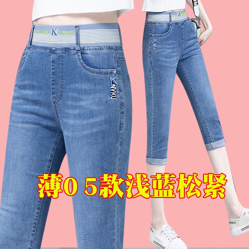 High waist jeans women's cropped pants summer thin section loose straight small elastic waist elastic thin large size pants
