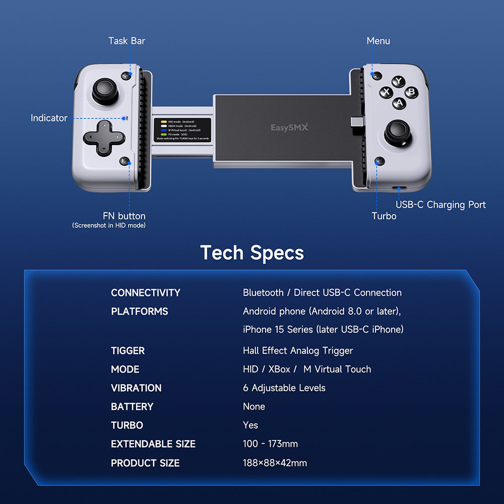 EasySMX M05 Type C Mobile Phone Controller for Cloud Gaming Xbox Game Pass, iphone 15 Series, xCloud, Mapping, Hall Effect