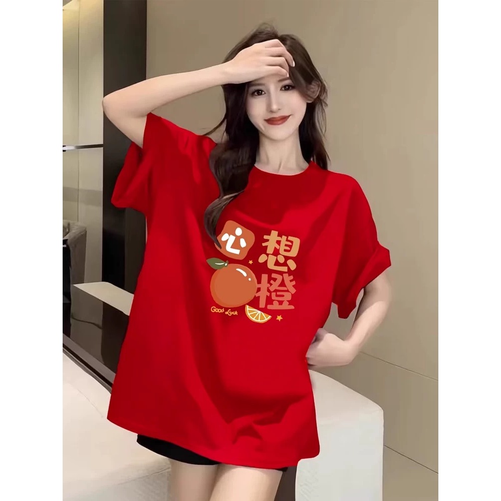 【 2026 CNY Chinese New Year 】Short Sleeve Cotton T-shirt Oversize Woman Baggy Loose Top Women Unique Ootd Lives Horse CNY Year