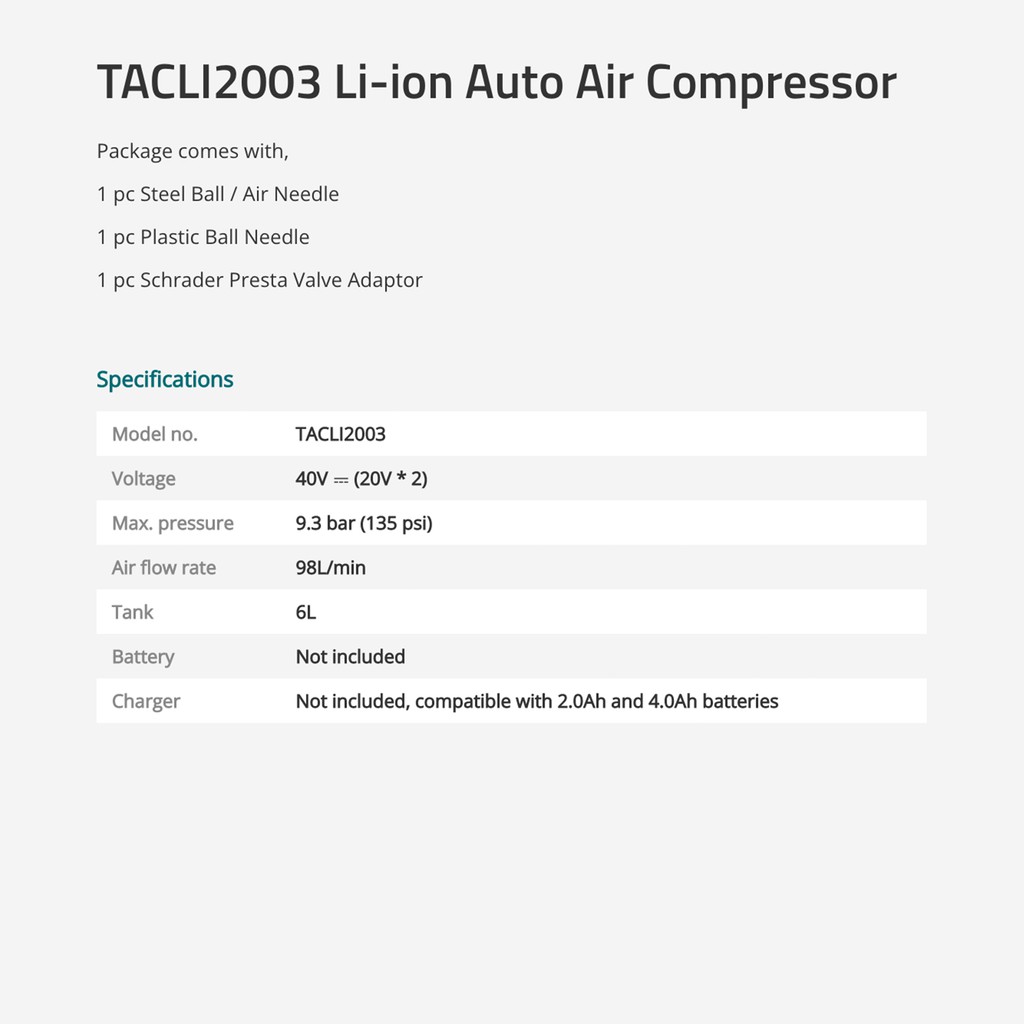 TOTAL Li-ion Auto Air Compressor (135 psi/9.3 Bar/20V) + Tank (6L) + Ball Needle P20S TACLI2003