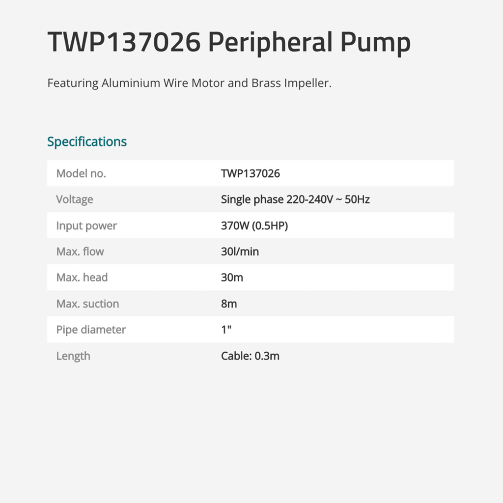 TOTAL Peripheral Pump Copper Wire Motor (370W/0.5HP) + Brass Impeller (Max Head 30M/Max Suction 8M) TWP137026
