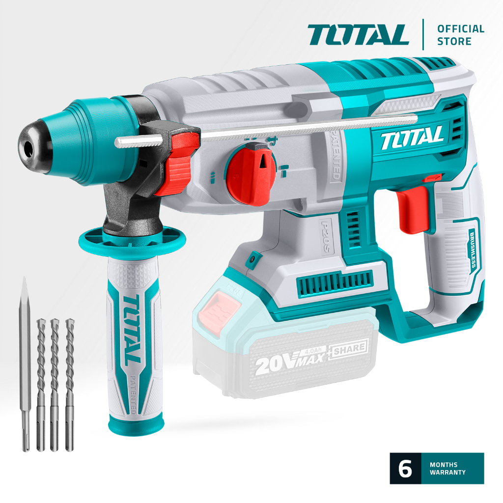 TOTAL Li-ion Rotary Hammer Solo, SDS+ With Brushless Motor (20V) [Free Drill Bits 3 Pcs & Chisel] P20S TRHLI20228