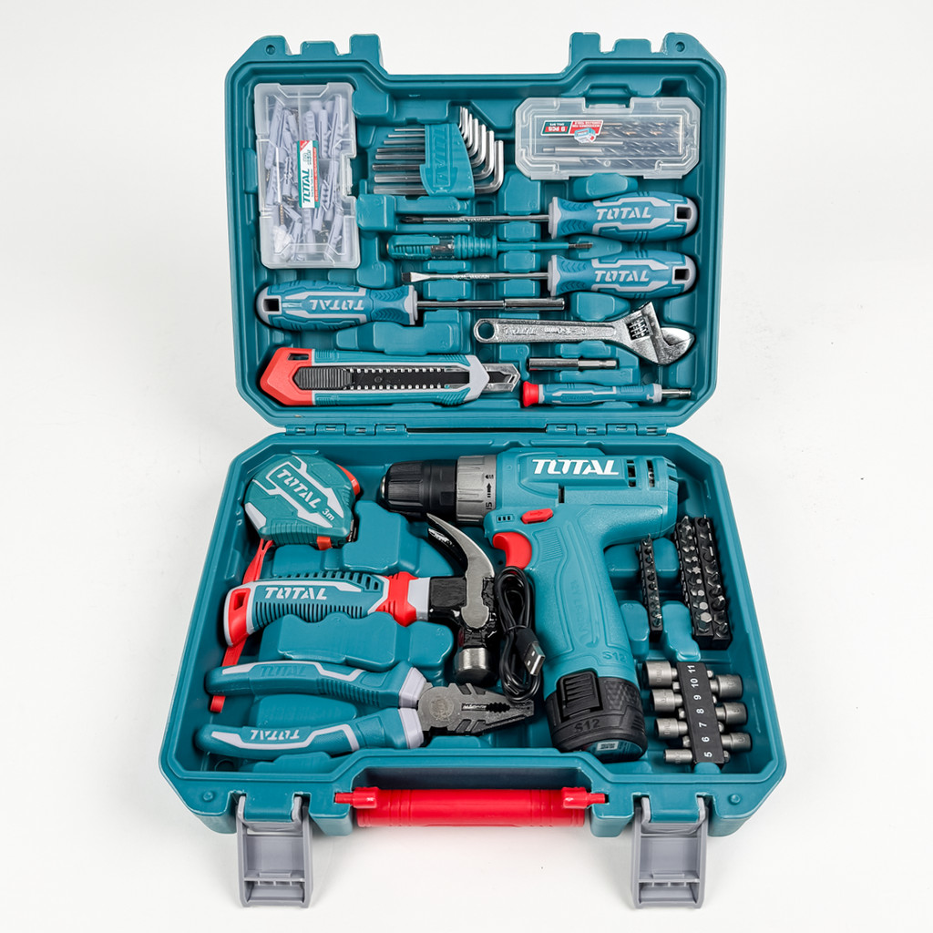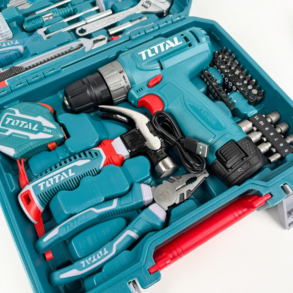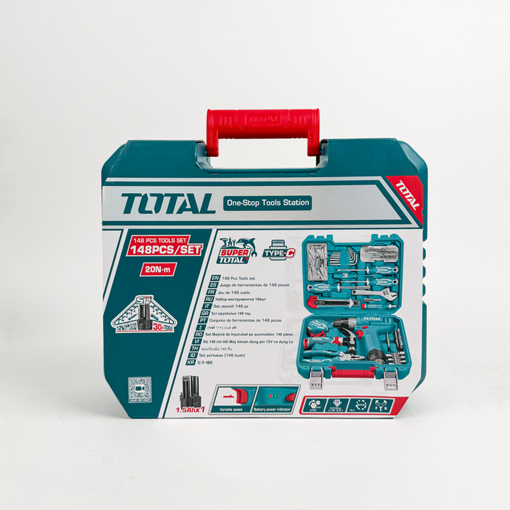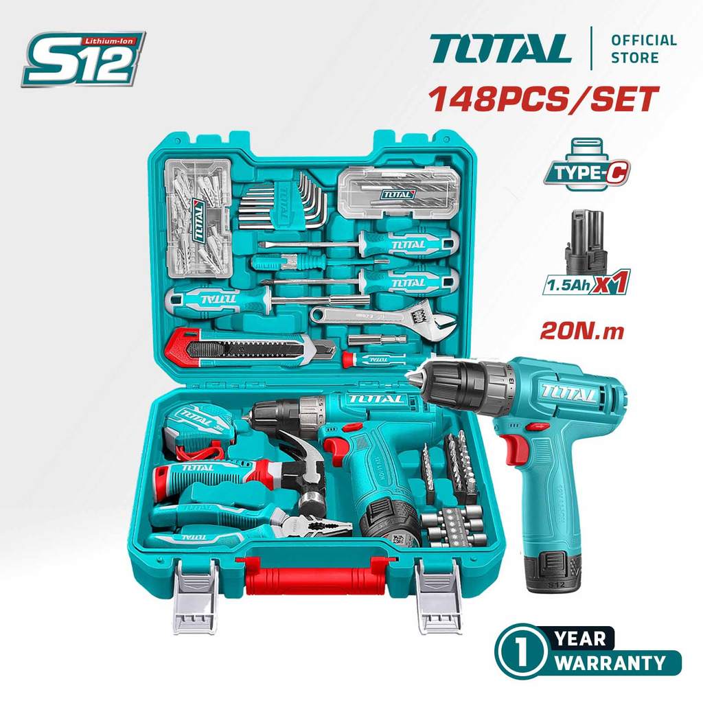 TOTAL Tools 148 Pcs Tool Set with Cordless Li-ion Drill + 1 Pc 1.5Ah Battery (S12 / 230Nm) + Plier + Wrench THKTHP41487