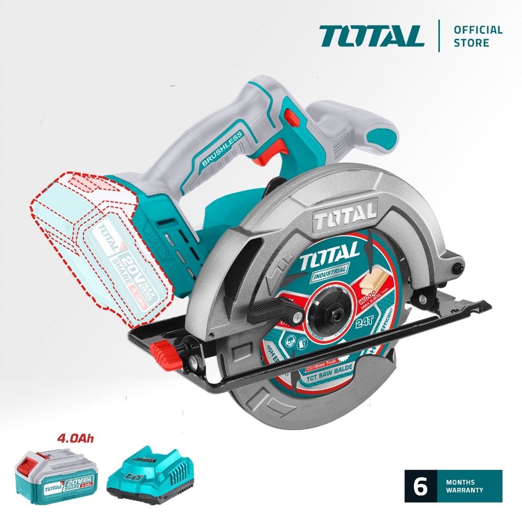 TOTAL Li-ion Circular Saw (185mm/20V) With Brushless Motor & Adjustable Bevel Angle + TCT Saw Blade (24T) P20S TSLI1851