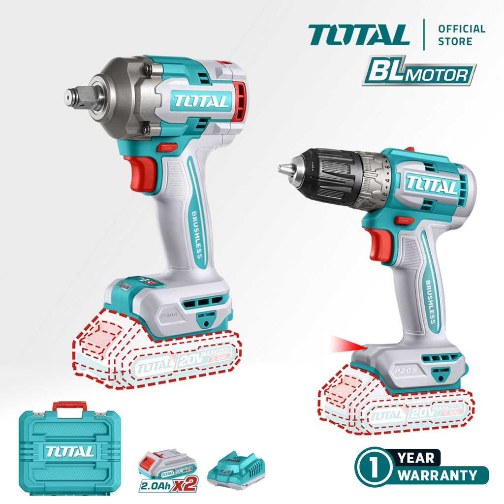 TOTAL 2 Pcs Combo Kit (P20S / 20V / Li-ion Impact Wrench + Li-ion Drill) TCKLI20271