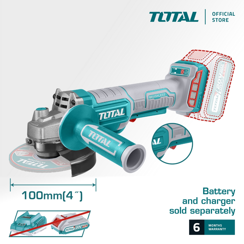 TOTAL Tools Cordless Angle Grinder + Battery + Charger (20V / 8000/min / M10 / 4" / Brushless) TAGLI211006