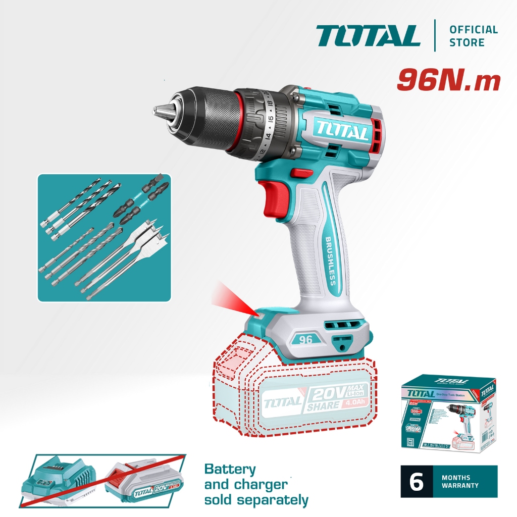 TOTAL Cordless Li-ion Impact Drill with Metal Chuck Head (P20S / 20V / 96Nm / Brushless) TIDLI209681 / TIDLI20968