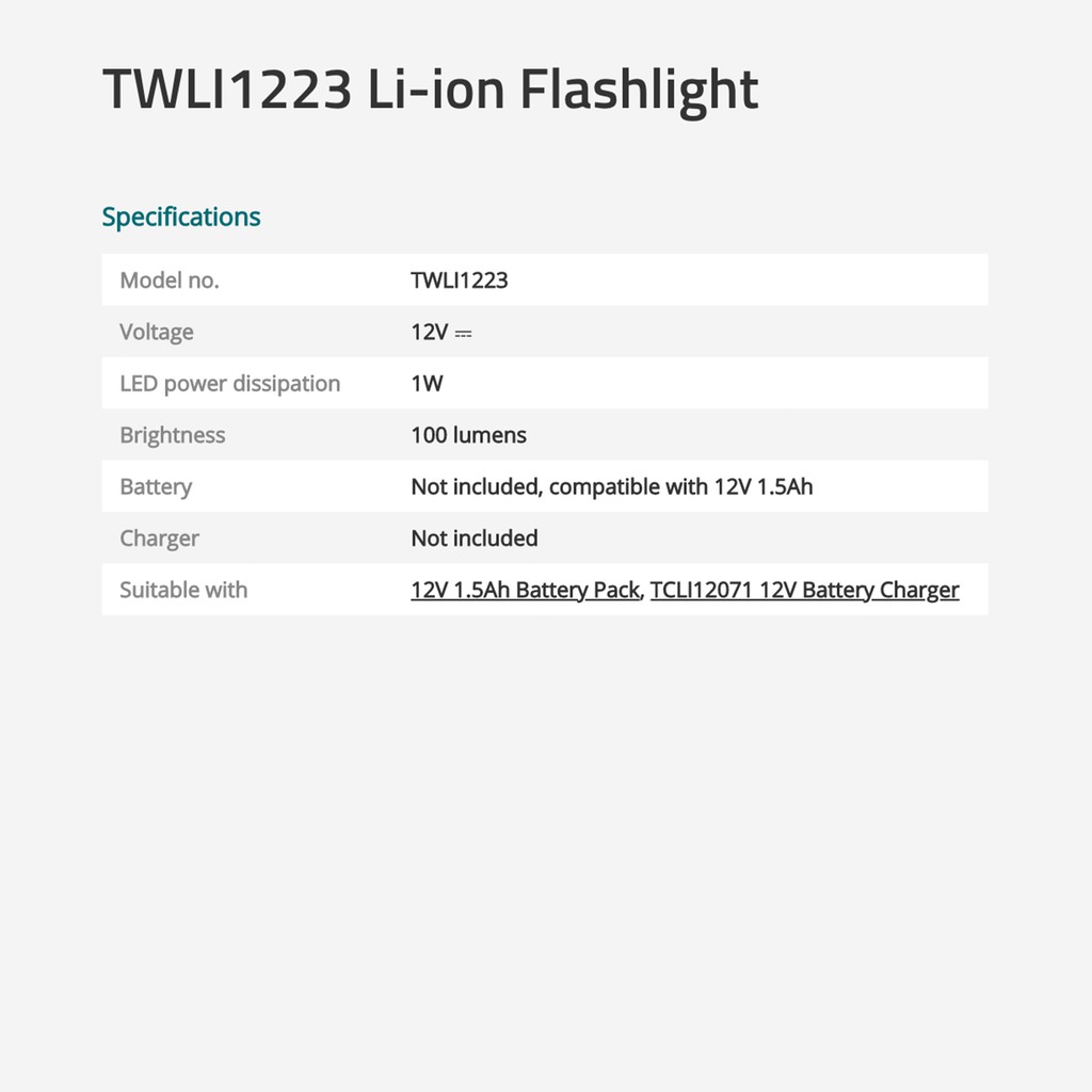 TOTAL Li-ion Flashlight LED (100 Lumens/1W/12V) S12 TWLI1223