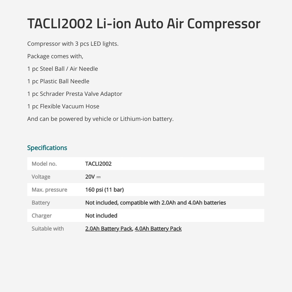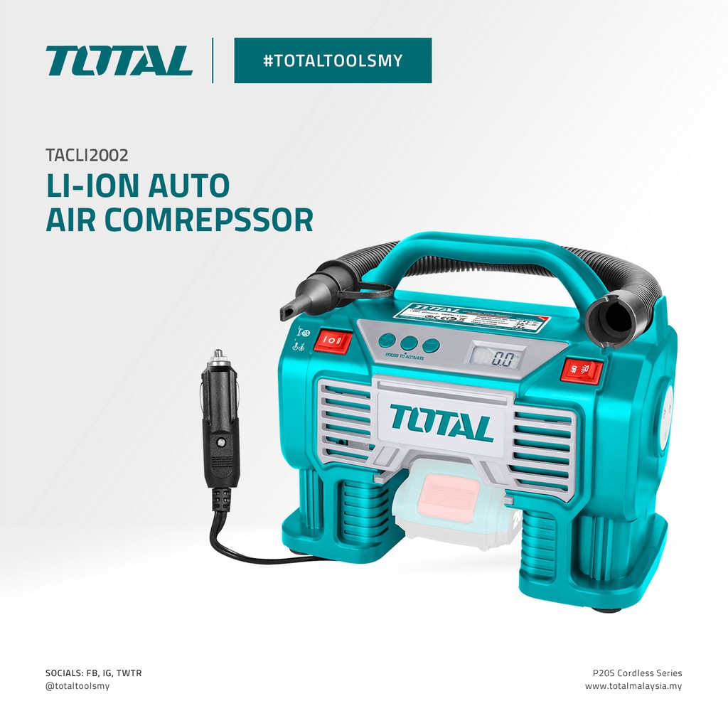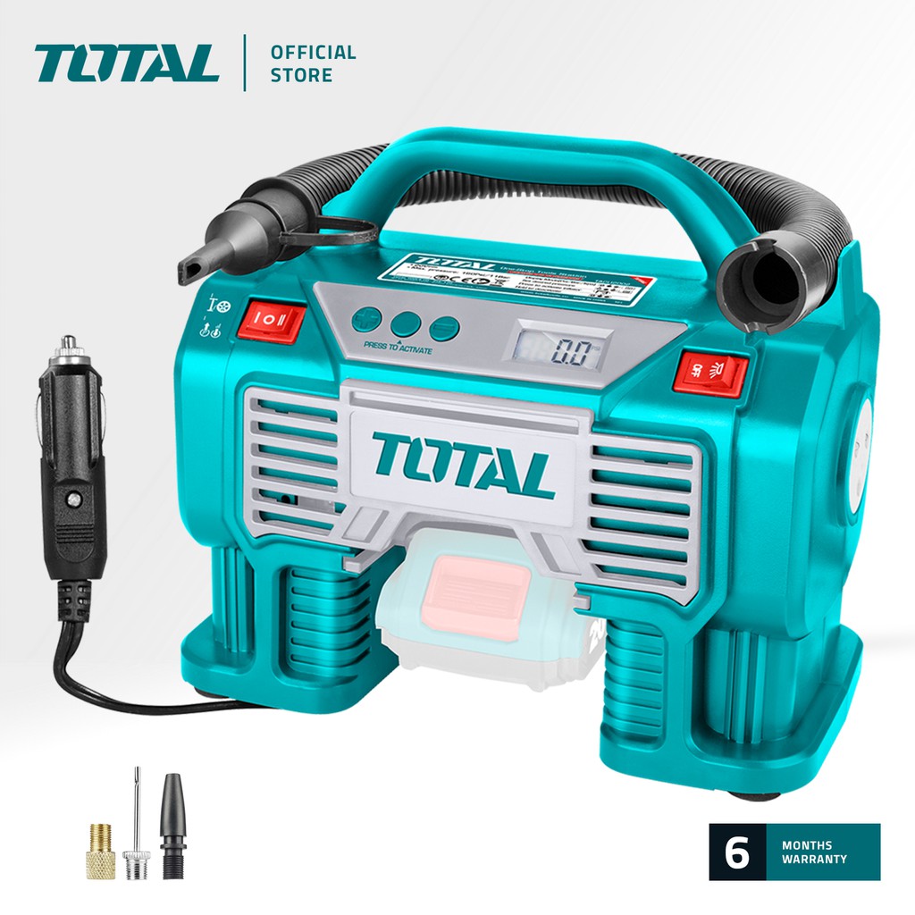 TOTAL Li-ion Auto Air Compressor (160 psi/11 Bar/20V) + Vacuum Hose + Ball Needle P20S TACLI2002