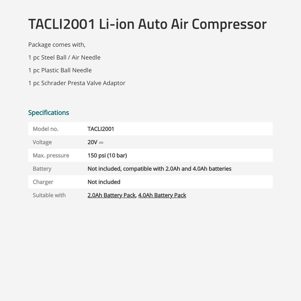 TOTAL Li-ion Auto Air Compressor (150 psi/10 Bar/20V) + Ball Needle P20S TACLI2018