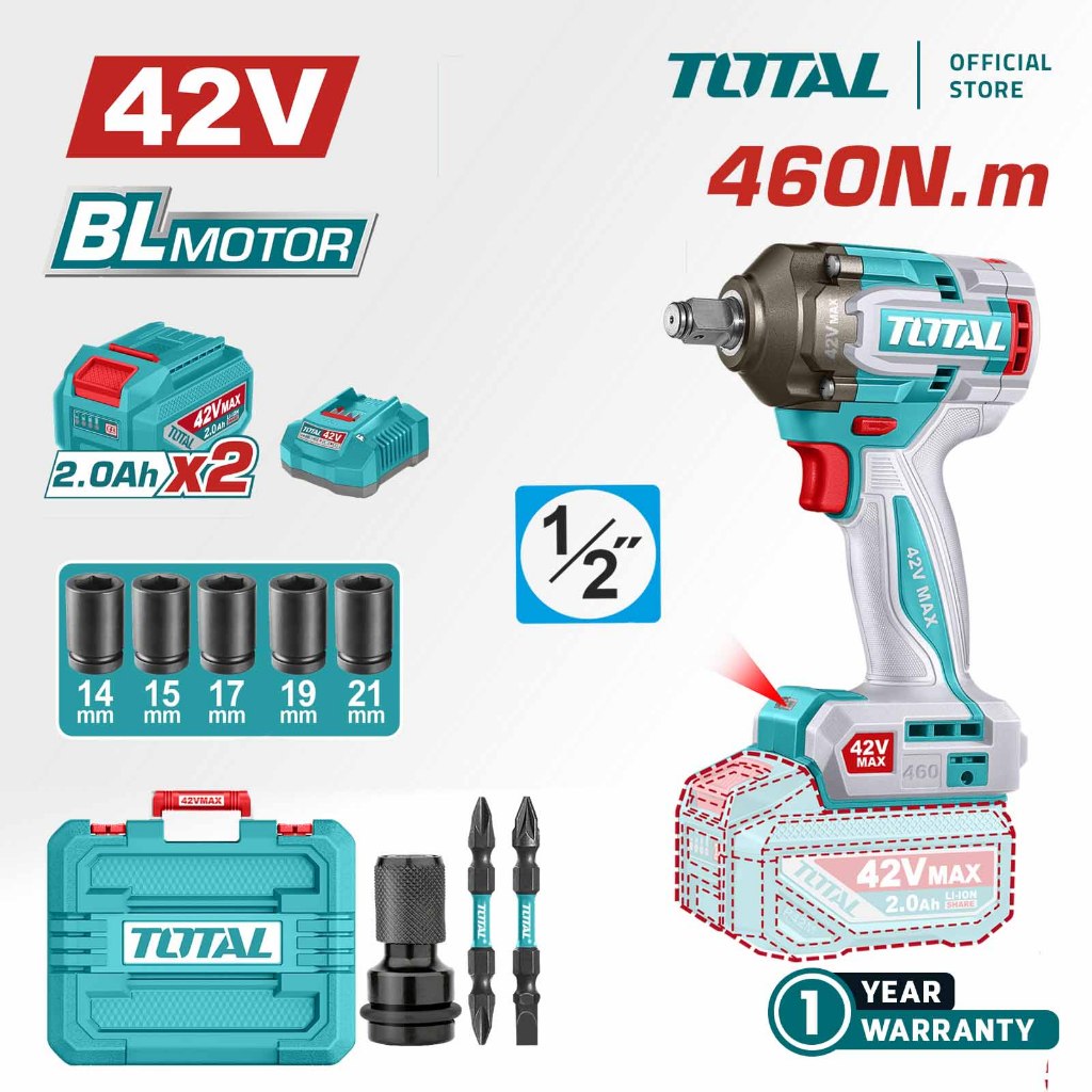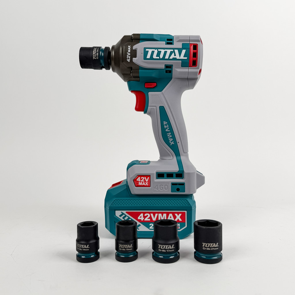 TOTAL Tools Cordless Impact Wrench + Battery + Charger + Sockets (42V / 460Nm / 1/2" / Brushless) TIWLI42462