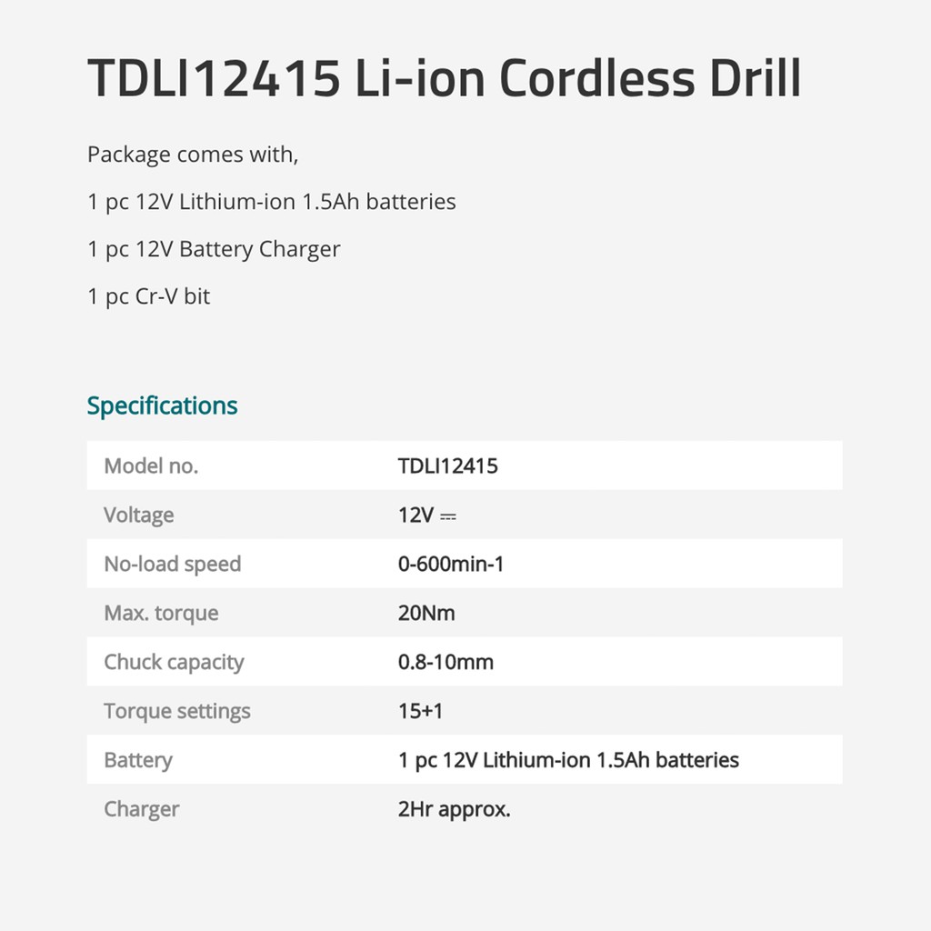 TOTAL Li-ion Cordless Drill (12V) + 1.5Ah Battery + Charger + Screwdriver Bit S12 TDLI12415