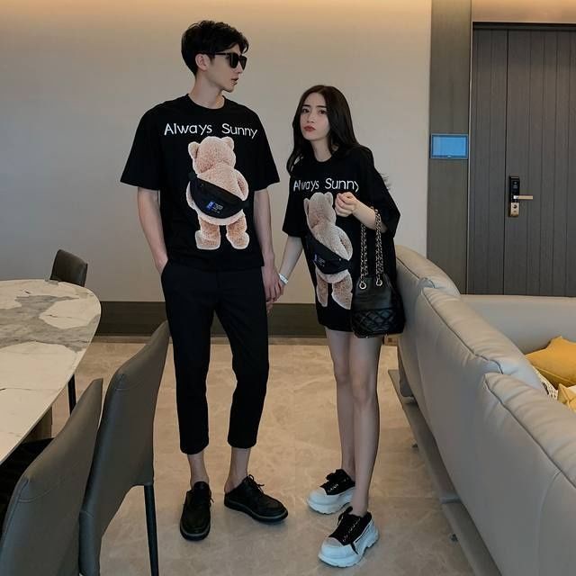 Sanchenghlby Summer New Style Pure Cotton Homemade Couple Wear Unique Creative Design Bear Backpack Printed Short-Sleeved T-Shirt