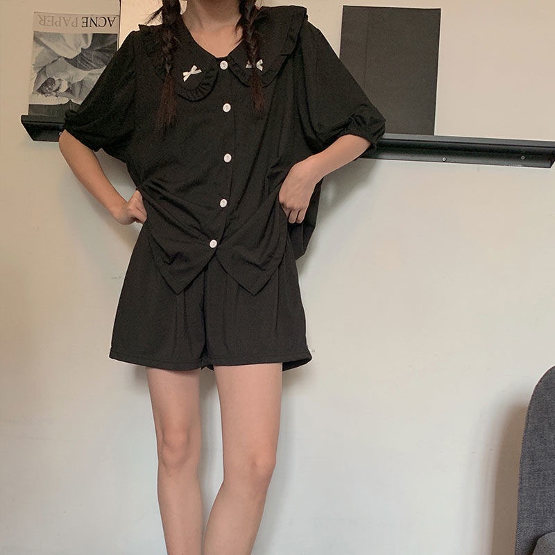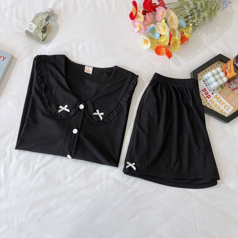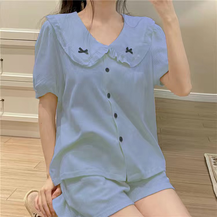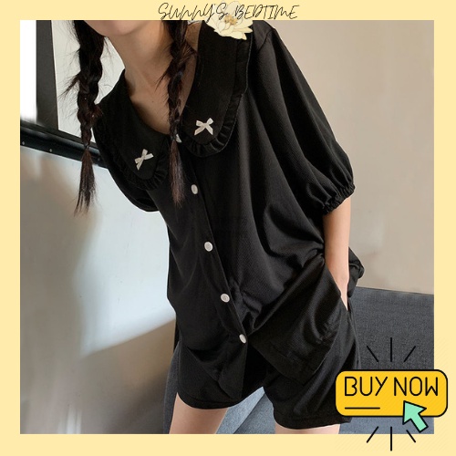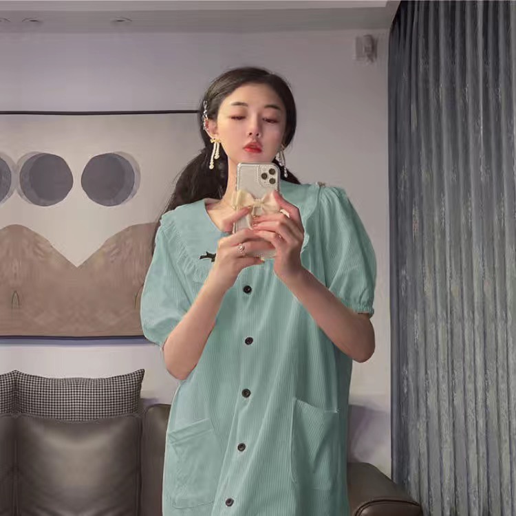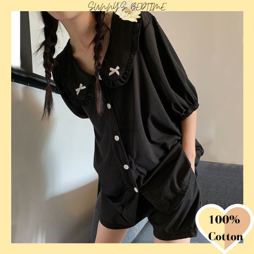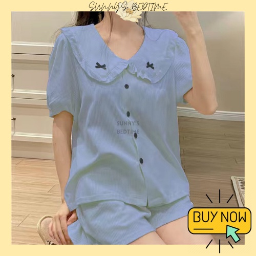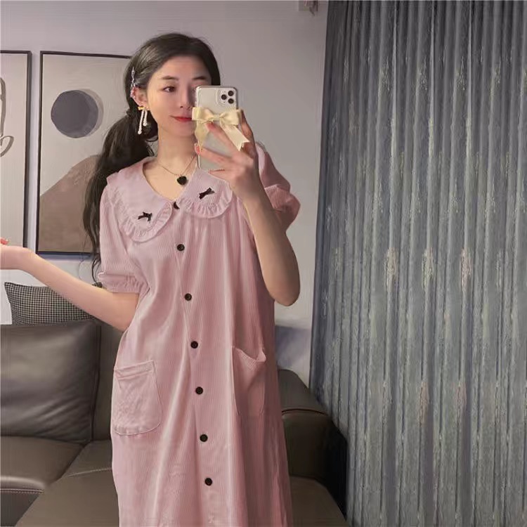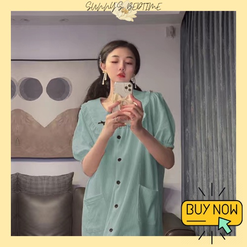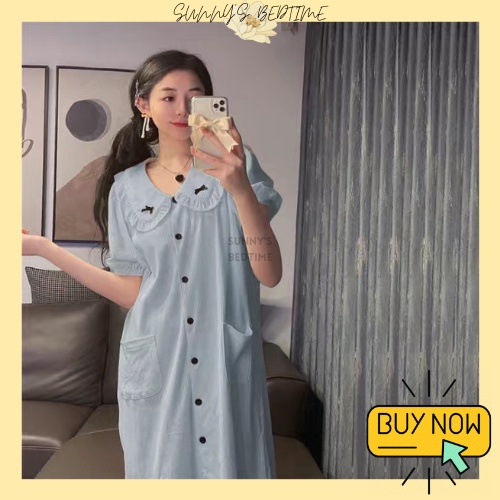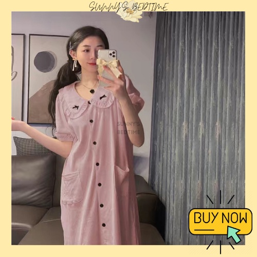 SUNNY 100% Cotton Cute Ribbon Short Sleeve Pyjamas Ribbon Dress Baju Tidur Wanita Cotton Night Dress Sleepwear Cotton