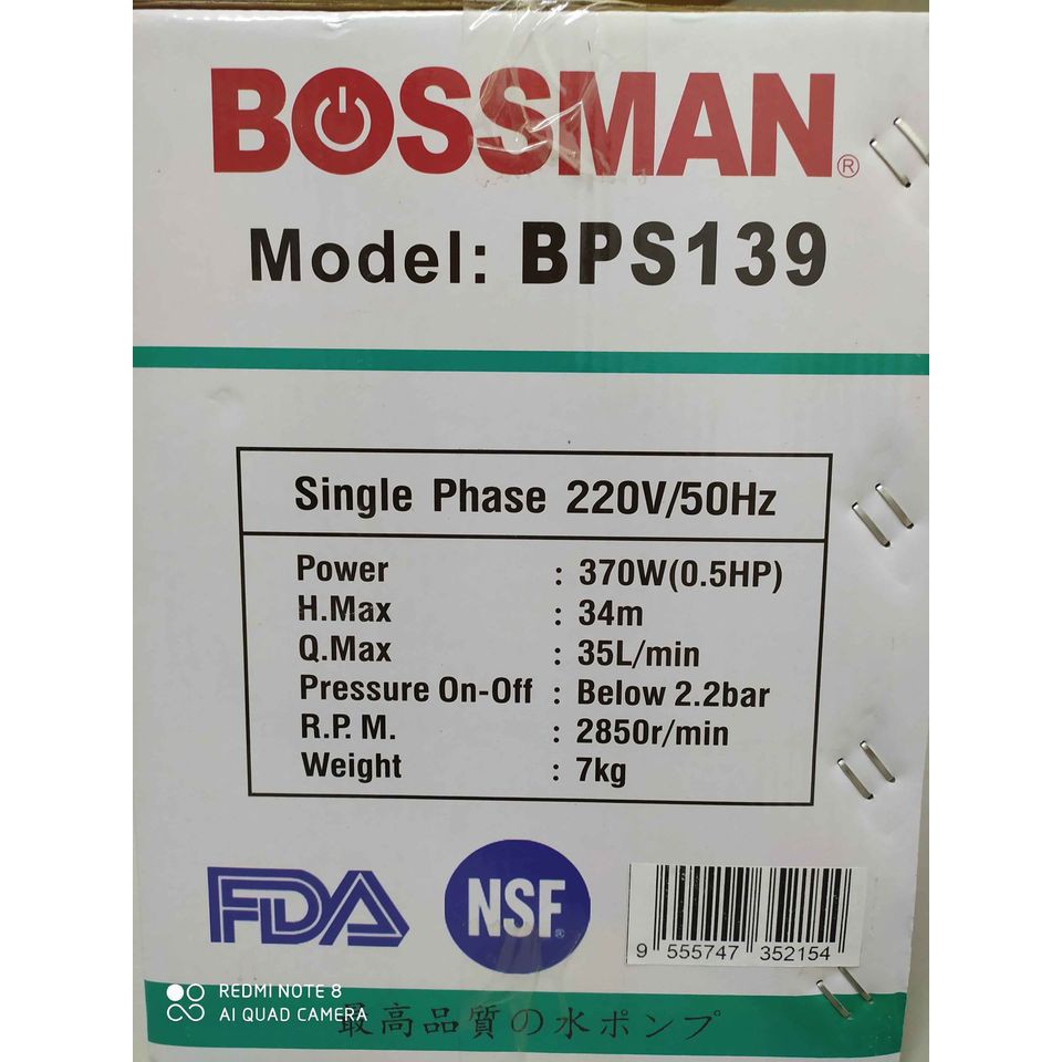 BOSSMAN 370W 0.5HP AUTO WATER BOOSTER PUMP ~BPS139 (SUPER VALUE PRODUCT)