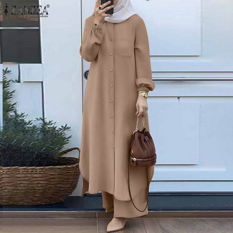 ZANZEA Women Long Sleeved Button Down Front Casual Front Pocket Muslim 2PCS Set