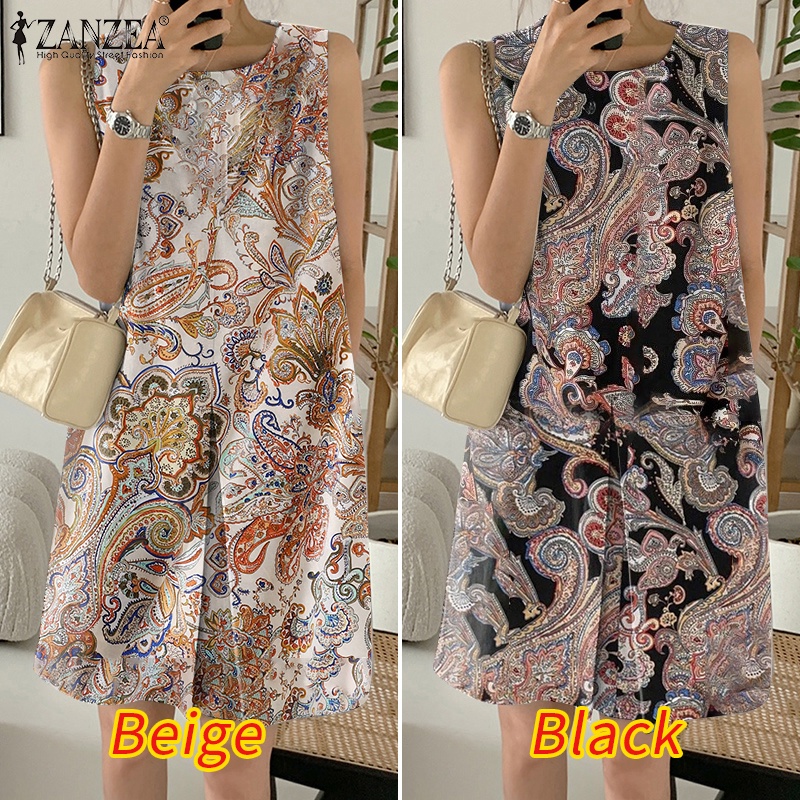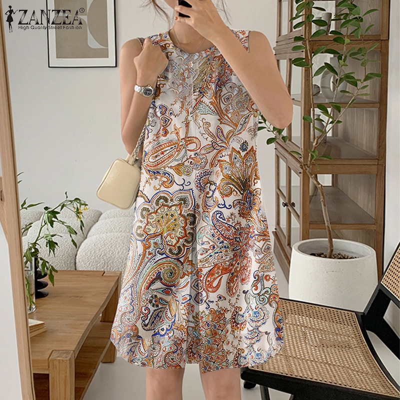ZANZEA Women Korean Sleeveless Round Neck Pleated Floral Printed Holiday Mini Dress