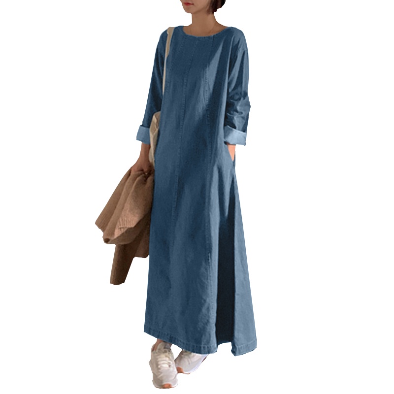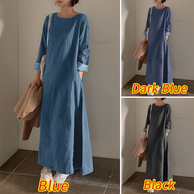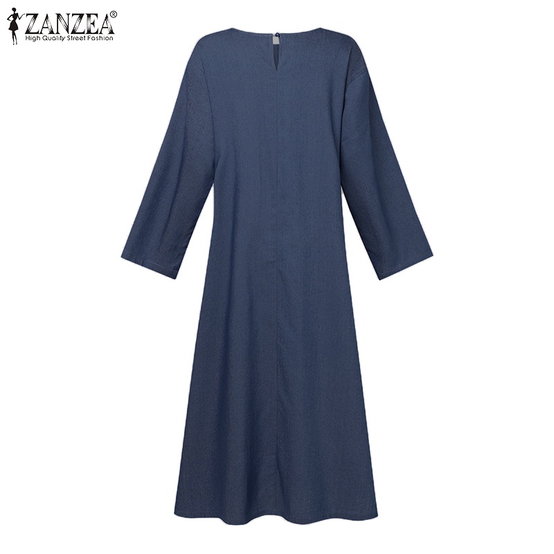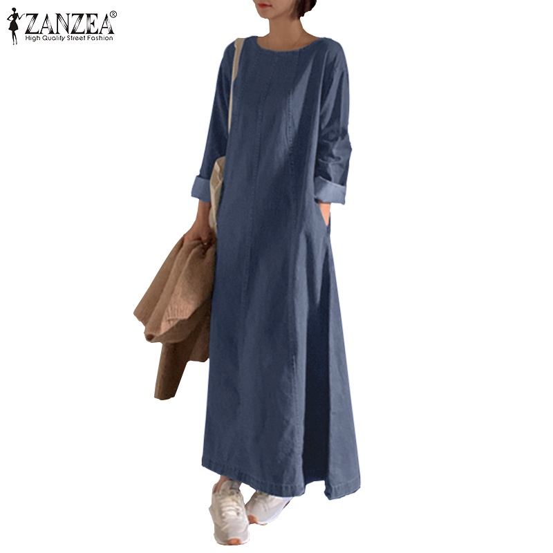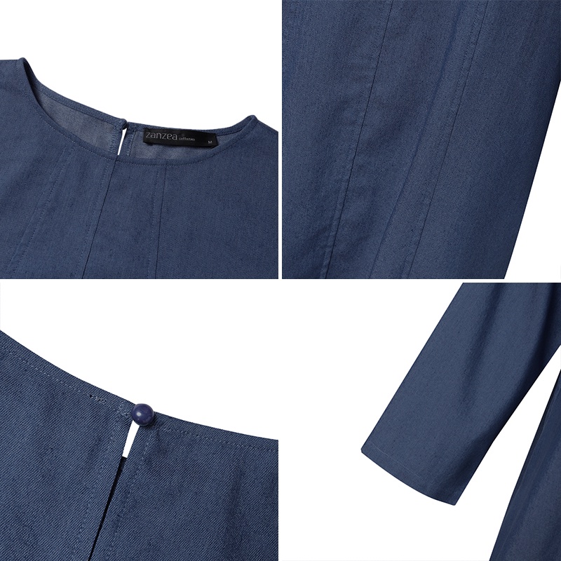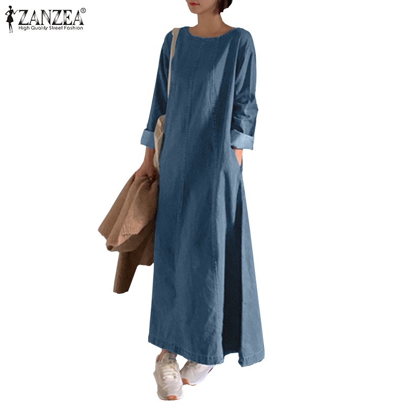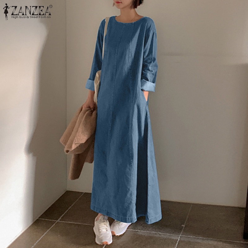 ZANZEA Women Korean Back Neck Split Long Sleeve Side Pockets Denim Dresses