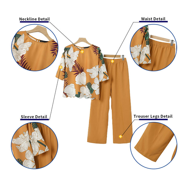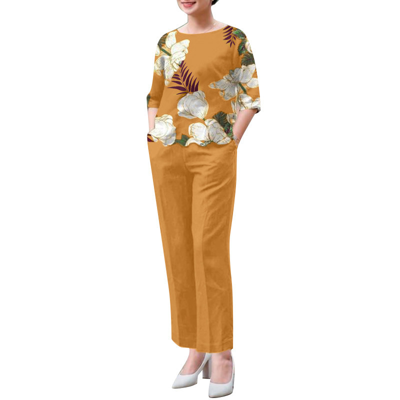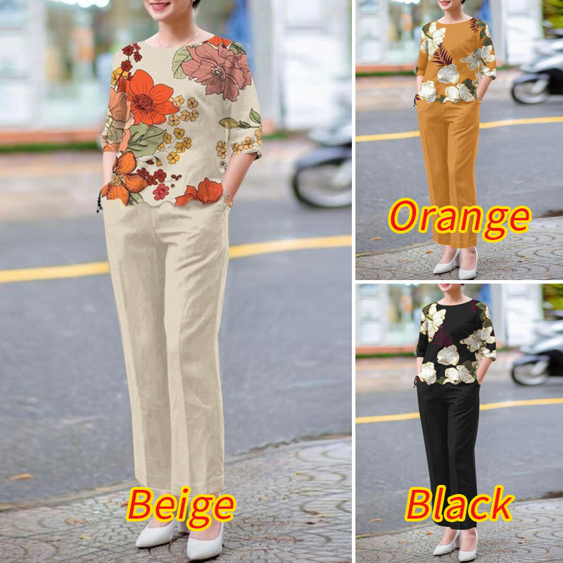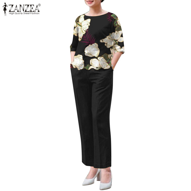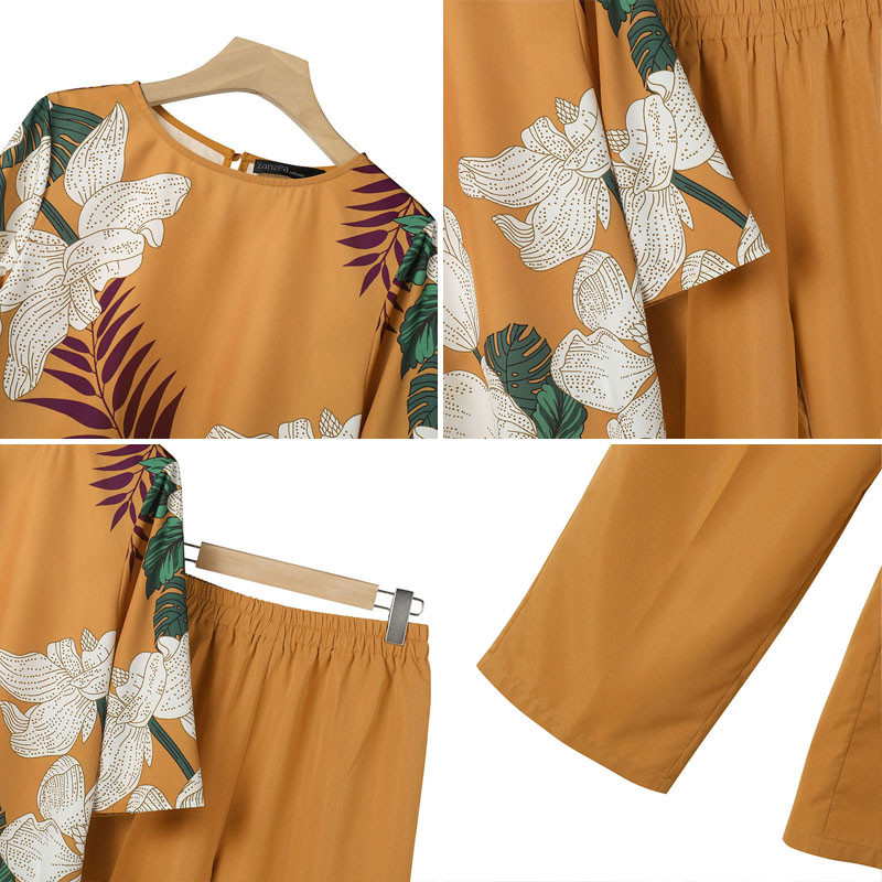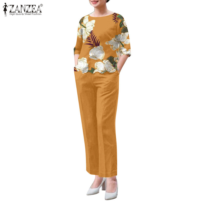 ZANZEA Women Vintage Boatneck Printed Elasticated Waistband Pockets Tops Trousers