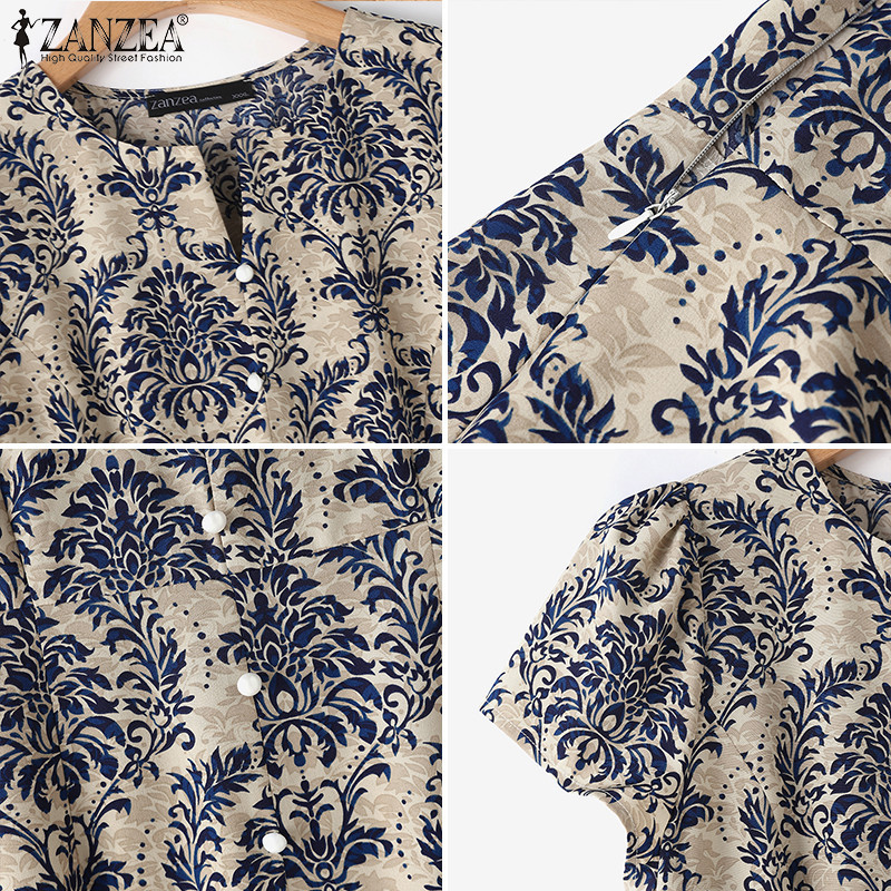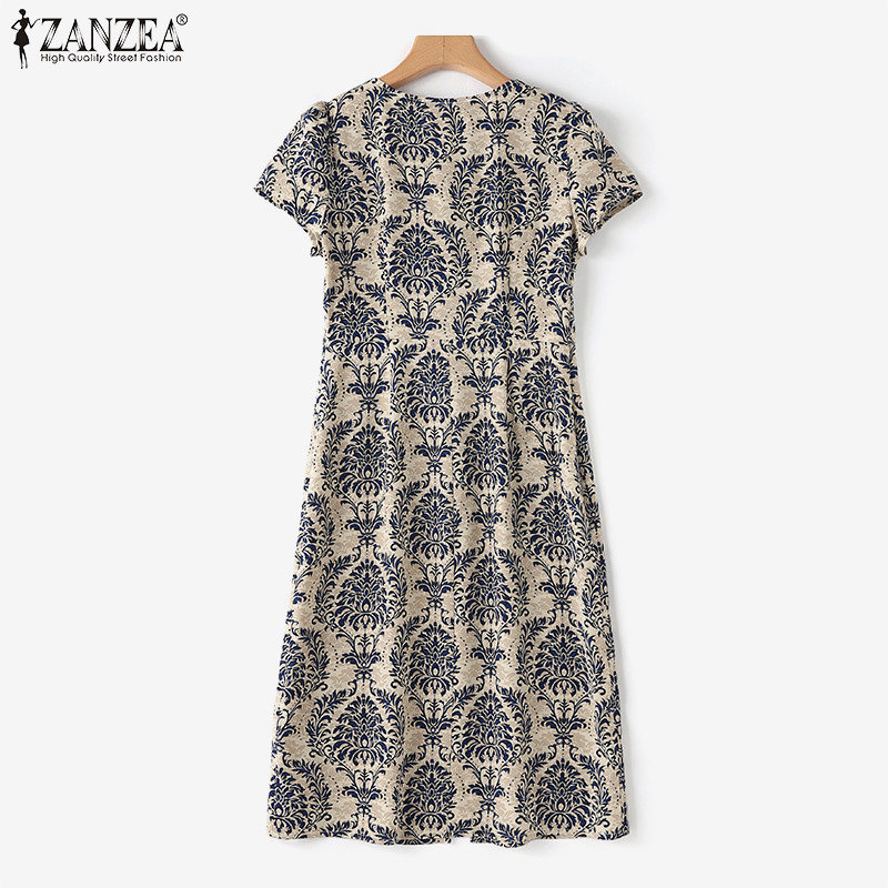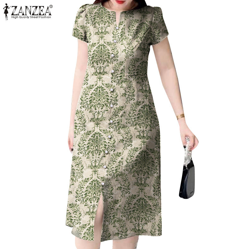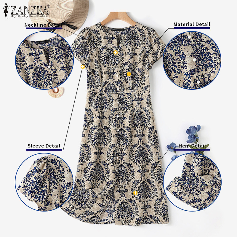 ZANZEA Women Korean Casual Slit Short Sleeve Front Decorative Buttons Loose Floral Print Dresses