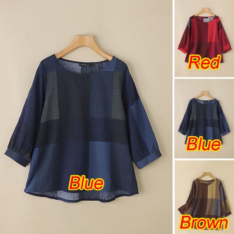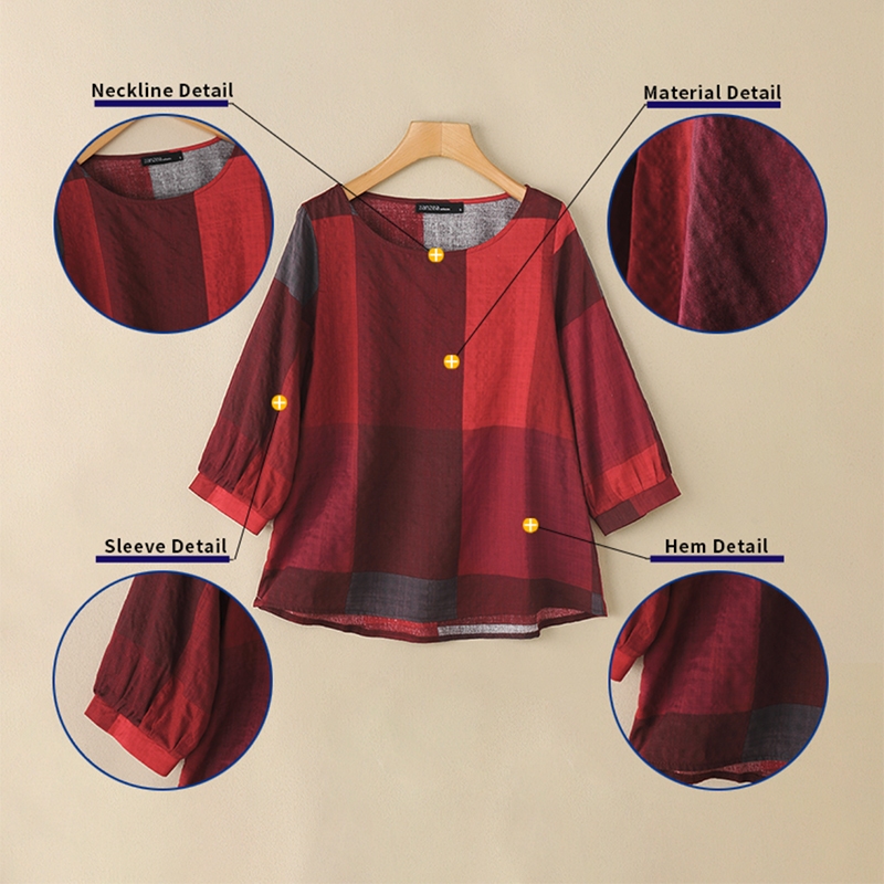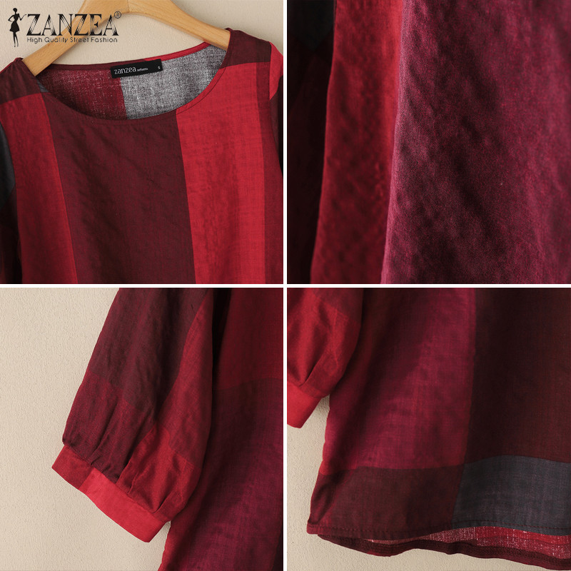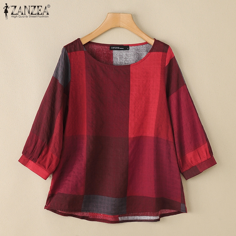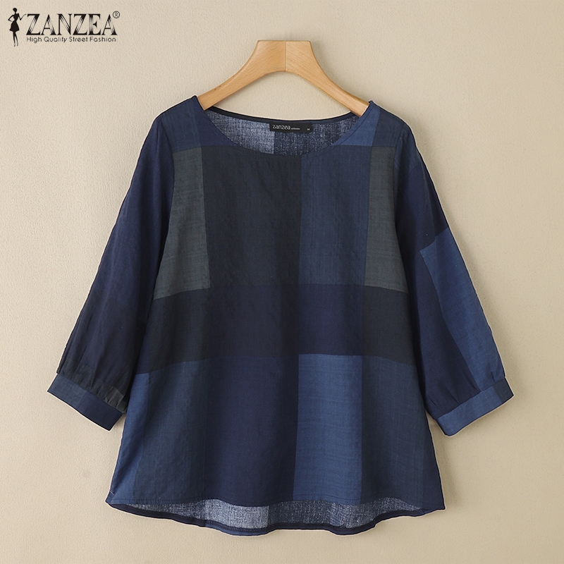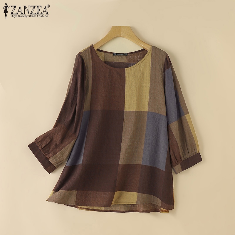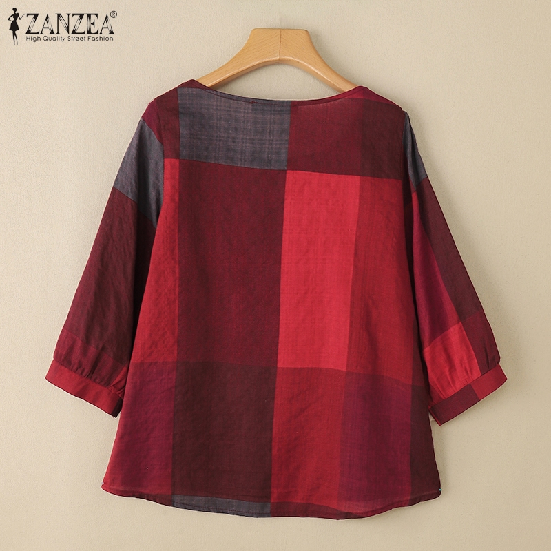 ZANZEA Women Casual Crew Neckline Three Quarter Sleeves Plaid Blouses
