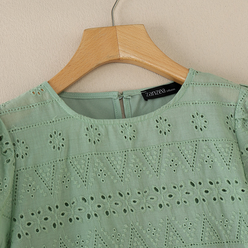 ZANZEA Women Korean Casual Round Neck Puff Sleeve Hollow Embroidery Loose Blouses