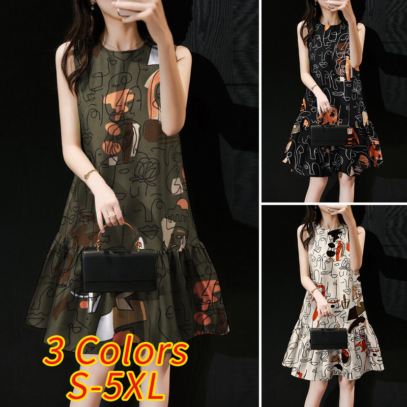 ZANZEA Women's Vintage Fishtail Ruffle Hem Print Sleeveless Fashion Dresses