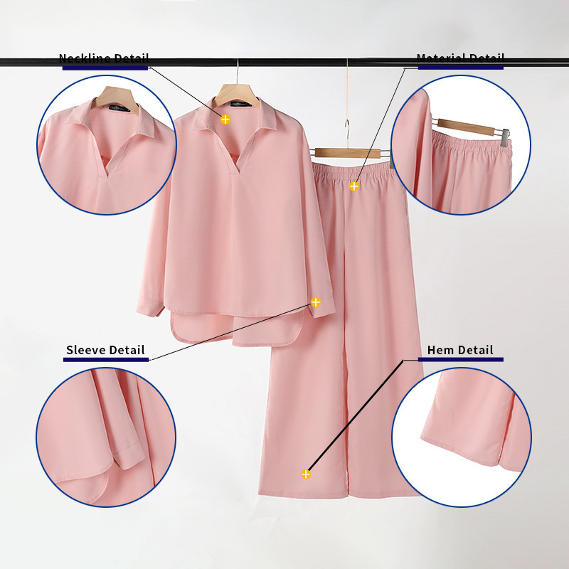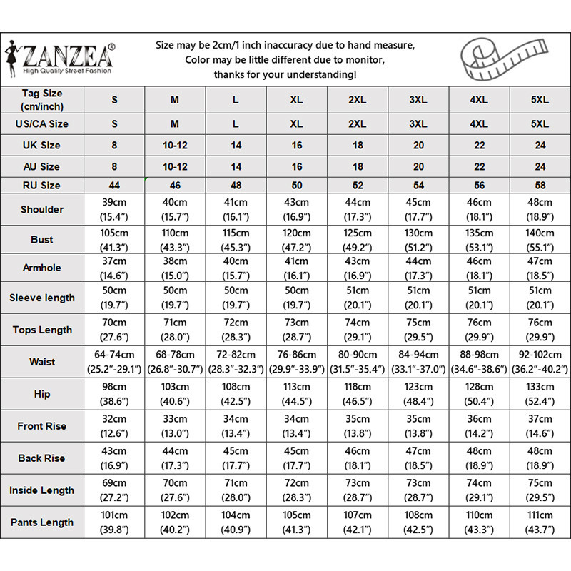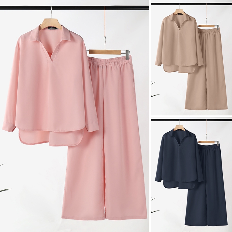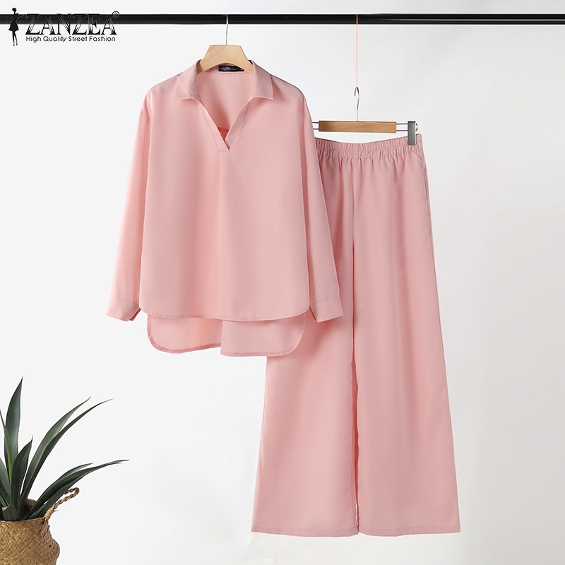 ZANZEA Women Korean Pleated Long Sleeve Top + Pockets Wide Leg Trouser Sets