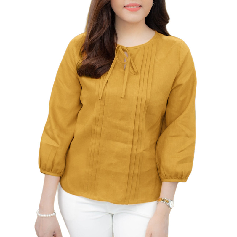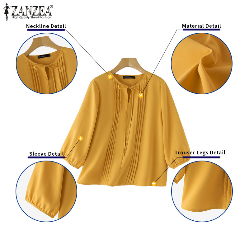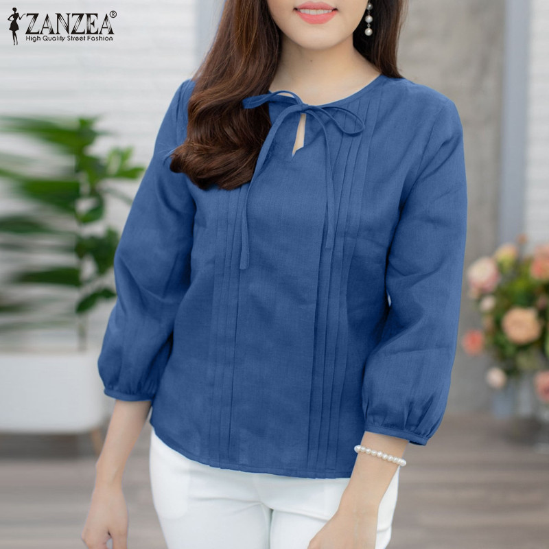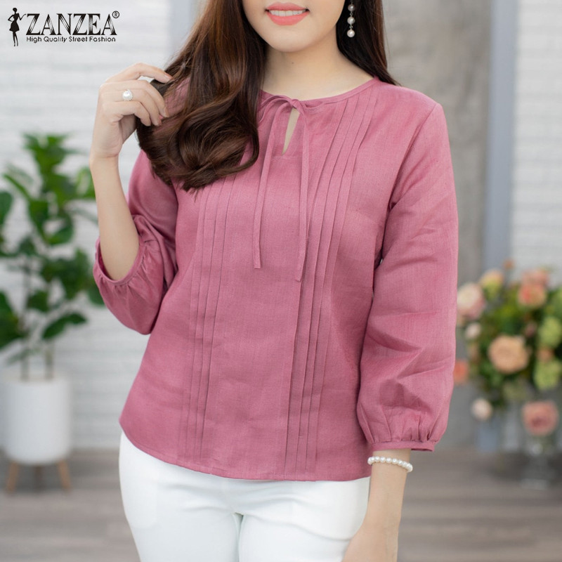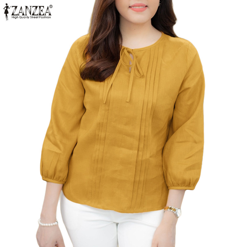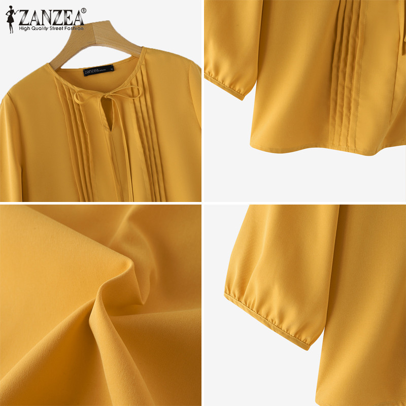ZANZEA Women Korean Casual Round Neck Ties Pleated Solid Color Blouses