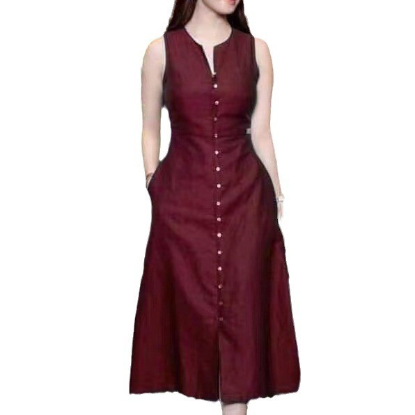 Korean Style Women's Dresses Summer Vintage Elegant Sleeveless V-Neck Plain Midi Dresses Fashion Casual Loose Showing Slim Front Split Dress Red Black Blue