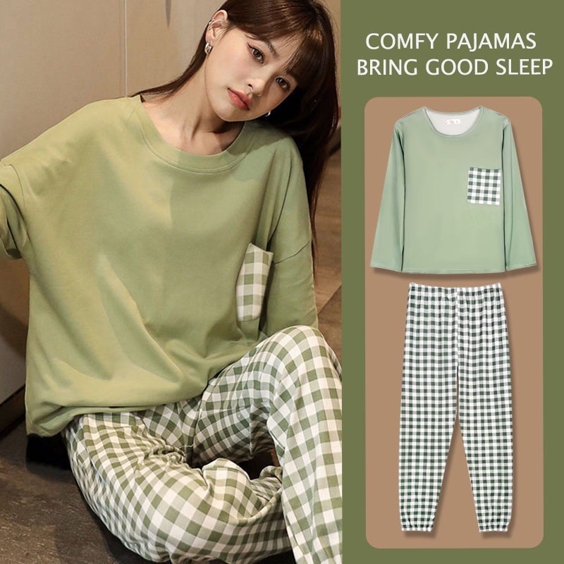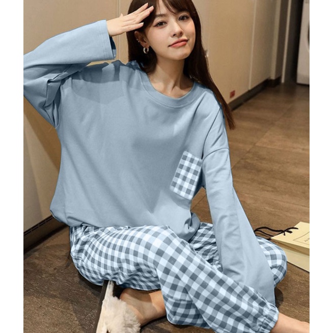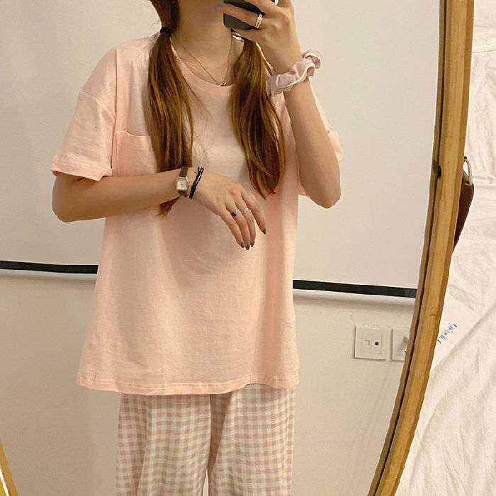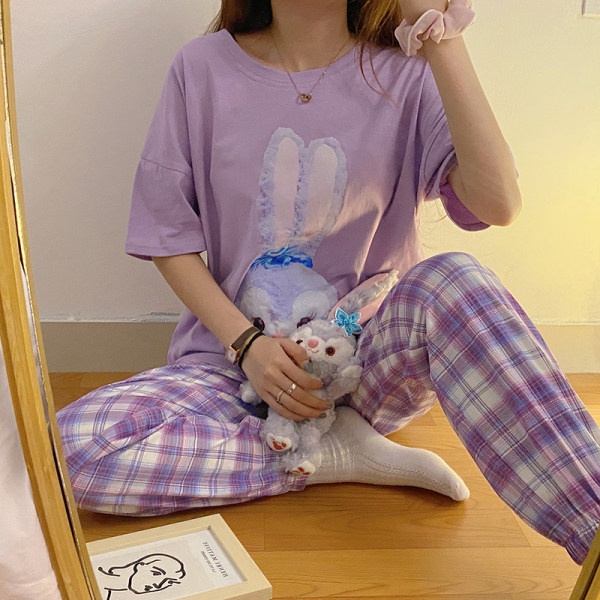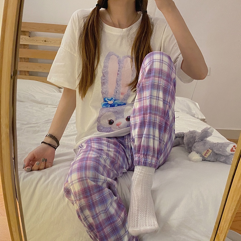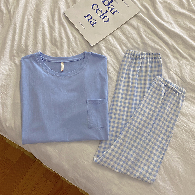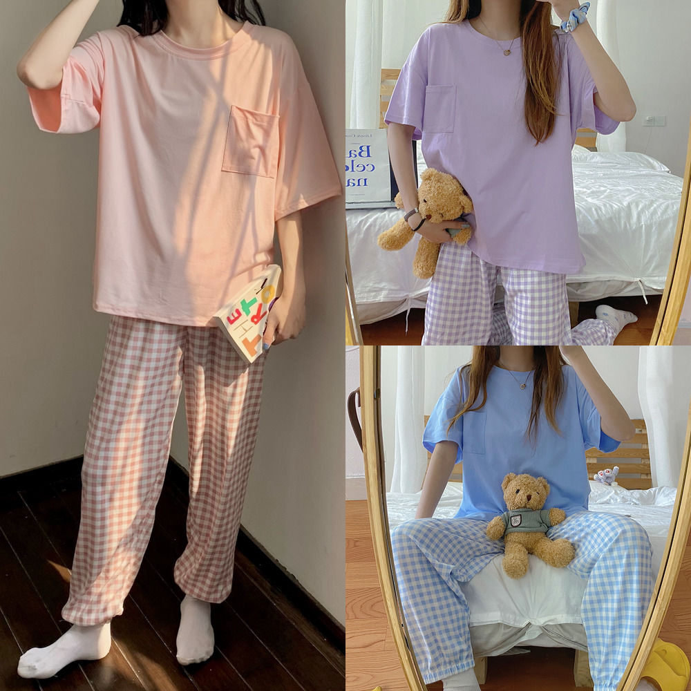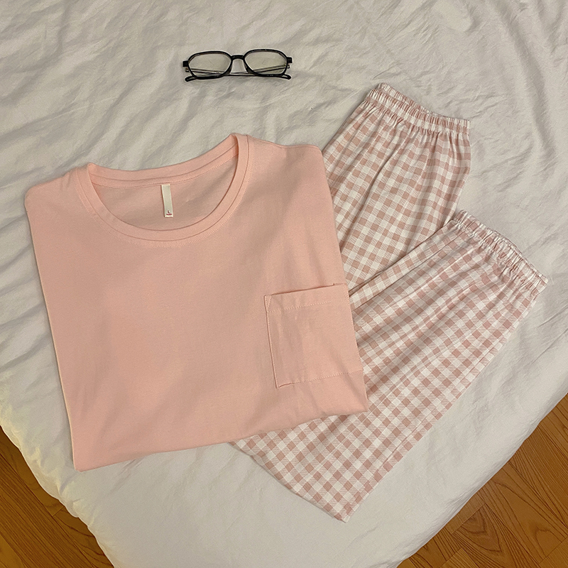 Korean plaid pyjamas pajamas women summer short-sleeved trousers nightwear set sleepwear