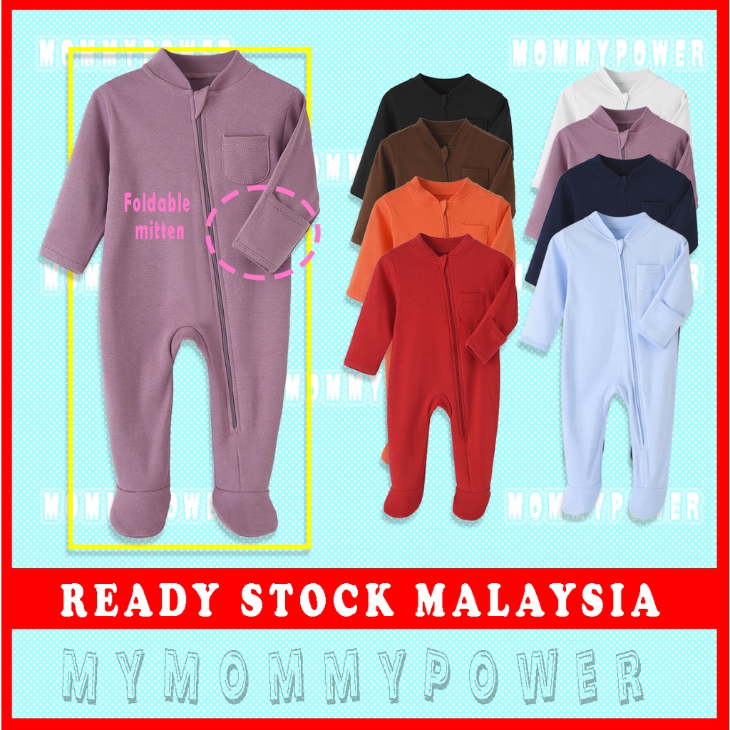 MALAYSIA 📶 3-12 Months Plain Sleepsuit Covered Footie And Hands Zip Baby Jumpsuit Sleepwear
